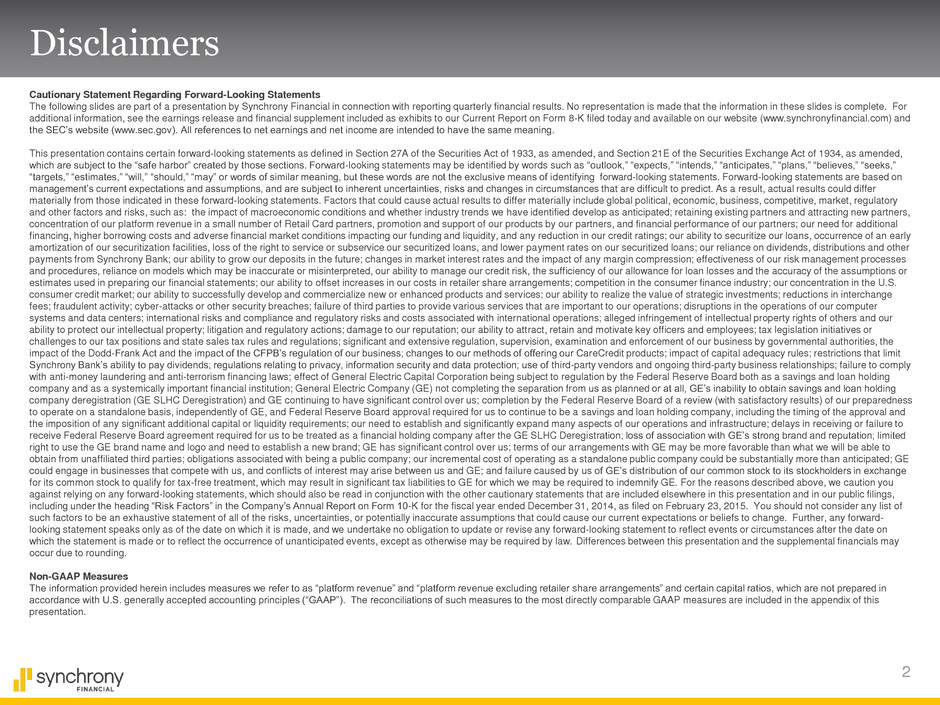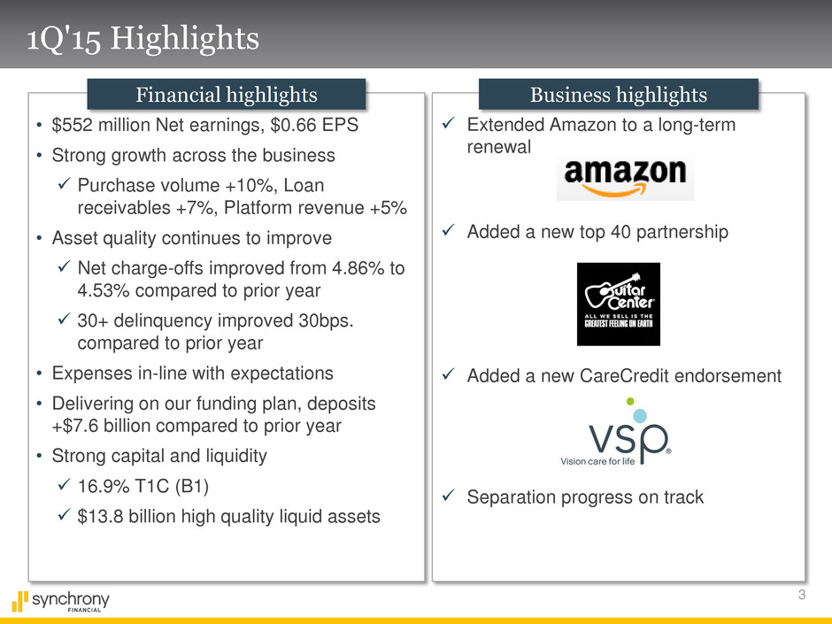 2 Cautionary Statement Regarding Forward-Looking Statements The following slides are part of a presentation by Synchrony Financial in connection with reporting quarterly financial results. No representation is made that the information in these slides is complete. For additional information, see the earnings release and financial supplement included as exhibits to our Current Report on Form 8-K filed today and available on our website (www.synchronyfinancial.com) and the SEC’s website (www.sec.gov). All references to net earnings and net income are intended to have the same meaning. This presentation contains certain forward-looking statements as defined in Section 27A of the Securities Act of 1933, as amended, and Section 21E of the Securities Exchange Act of 1934, as amended, which are subject to the “safe harbor” created by those sections. Forward-looking statements may be identified by words such as “outlook,” “expects,” “intends,” “anticipates,” “plans,” “believes,” “seeks,” “targets,” “estimates,” “will,” “should,” “may” or words of similar meaning, but these words are not the exclusive means of identifying forward-looking statements. Forward-looking statements are based on management’s current expectations and assumptions, and are subject to inherent uncertainties, risks and changes in circumstances that are difficult to predict. As a result, actual results could differ materially from those indicated in these forward-looking statements. Factors that could cause actual results to differ materially include global political, economic, business, competitive, market, regulatory and other factors and risks, such as: the impact of macroeconomic conditions and whether industry trends we have identified develop as anticipated; retaining existing partners and attracting new partners, concentration of our platform revenue in a small number of Retail Card partners, promotion and support of our products by our partners, and financial performance of our partners; our need for additional financing, higher borrowing costs and adverse financial market conditions impacting our funding and liquidity, and any reduction in our credit ratings; our ability to securitize our loans, occurrence of an early amortization of our securitization facilities, loss of the right to service or subservice our securitized loans, and lower payment rates on our securitized loans; our reliance on dividends, distributions and other payments from Synchrony Bank; our ability to grow our deposits in the future; changes in market interest rates and the impact of any margin compression; effectiveness of our risk management processes and procedures, reliance on models which may be inaccurate or misinterpreted, our ability to manage our credit risk, the sufficiency of our allowance for loan losses and the accuracy of the assumptions or estimates used in preparing our financial statements; our ability to offset increases in our costs in retailer share arrangements; competition in the consumer finance industry; our concentration in the U.S. consumer credit market; our ability to successfully develop and commercialize new or enhanced products and services; our ability to realize the value of strategic investments; reductions in interchange fees; fraudulent activity; cyber-attacks or other security breaches; failure of third parties to provide various services that are important to our operations; disruptions in the operations of our computer systems and data centers; international risks and compliance and regulatory risks and costs associated with international operations; alleged infringement of intellectual property rights of others and our ability to protect our intellectual property; litigation and regulatory actions; damage to our reputation; our ability to attract, retain and motivate key officers and employees; tax legislation initiatives or challenges to our tax positions and state sales tax rules and regulations; significant and extensive regulation, supervision, examination and enforcement of our business by governmental authorities, the impact of the Dodd-Frank Act and the impact of the CFPB’s regulation of our business; changes to our methods of offering our CareCredit products; impact of capital adequacy rules; restrictions that limit Synchrony Bank’s ability to pay dividends; regulations relating to privacy, information security and data protection; use of third-party vendors and ongoing third-party business relationships; failure to comply with anti-money laundering and anti-terrorism financing laws; effect of General Electric Capital Corporation being subject to regulation by the Federal Reserve Board both as a savings and loan holding company and as a systemically important financial institution; General Electric Company (GE) not completing the separation from us as planned or at all, GE’s inability to obtain savings and loan holding company deregistration (GE SLHC Deregistration) and GE continuing to have significant control over us; completion by the Federal Reserve Board of a review (with satisfactory results) of our preparedness to operate on a standalone basis, independently of GE, and Federal Reserve Board approval required for us to continue to be a savings and loan holding company, including the timing of the approval and the imposition of any significant additional capital or liquidity requirements; our need to establish and significantly expand many aspects of our operations and infrastructure; delays in receiving or failure to receive Federal Reserve Board agreement required for us to be treated as a financial holding company after the GE SLHC Deregistration; loss of association with GE’s strong brand and reputation; limited right to use the GE brand name and logo and need to establish a new brand; GE has significant control over us; terms of our arrangements with GE may be more favorable than what we will be able to obtain from unaffiliate