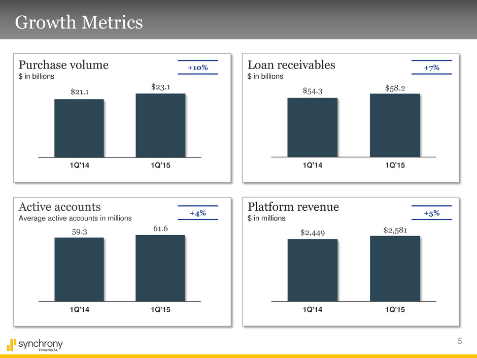 4 Digital, Loyalty and Analytics Capabilities LOYALTY ANALYTICS MOBILE • Digital wallets: Apple Pay Samsung Pay CurrentC • Mobile services: Application Servicing Rewards Payment • Digital cards • GPShopper investment Proprietary Closed-Loop Network • Enables valuable data capture • Integrated multi- tender loyalty solution • Ability to deliver targeted offers across channels • Seamlessly migrate non- credit customers to credit products ONLINE • Partnered with retailers growing online • CareCredit Provider Locator • 31% of apps through digital channels in 2014 • 2014 digital purchase volume up 18% vs. 2013 • Receive SKU/category level data on over 50% of SYF’s network transactions • Actionable retail analytics, market research and creative services • Dedicated analytic centers and Synchrony Connect advisory team to drive growth • No interchange fees (a) Includes online and mobile (a) (a)