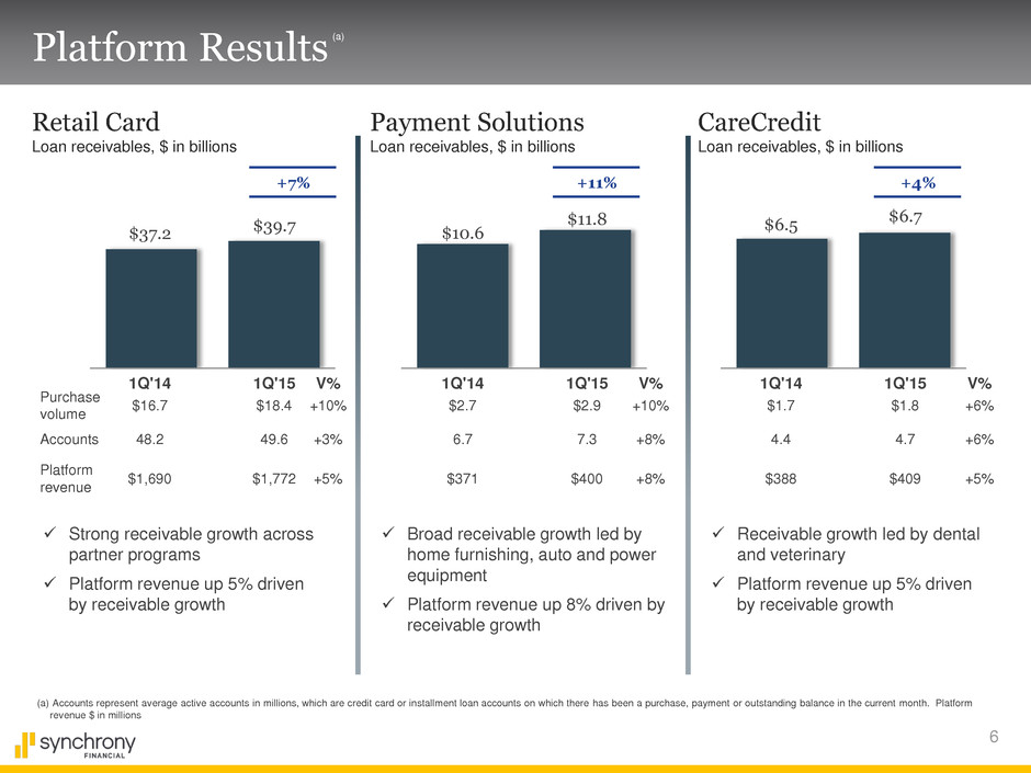 5 Growth Metrics +10% Purchase volume $ in billions Loan receivables $ in billions Active accounts Average active accounts in millions Platform revenue $ in millions 1Q'14 1Q'15 $21.1 $23.1 $54.3 $58.2 $2,581 $2,449 61.6 59.3 +4% +5% +7% 1Q'14 1Q'15 1Q'14 1Q'15 1Q'14 1Q'15