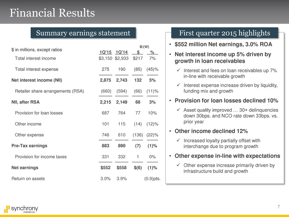 6 Platform Results Retail Card Loan receivables, $ in billions $37.2 $39.7 1Q'14 1Q'15 Strong receivable growth across partner programs Platform revenue up 5% driven by receivable growth Payment Solutions Loan receivables, $ in billions $10.6 $11.8 1Q'14 1Q'15 Broad receivable growth led by home furnishing, auto and power equipment Platform revenue up 8% driven by receivable growth CareCredit Loan receivables, $ in billions $6.5 $6.7 1Q'14 1Q'15 Receivable growth led by dental and veterinary Platform revenue up 5% driven by receivable growth Purchase volume Accounts $16.7 48.2 $18.4 49.6 +10% +3% $2.7 6.7 $2.9 7.3 +10% +8% $1.7 4.4 $1.8 4.7 +6% +6% Platform revenue $1,690 $1,772 +5% $371 $400 +8% $388 $409 +5% +7% +11% +4% (a) (a) Accounts represent average active accounts in millions, which are credit card or installment loan accounts on which there has been a purchase, payment or outstanding balance in the current month. Platform revenue $ in millions V% V% V%