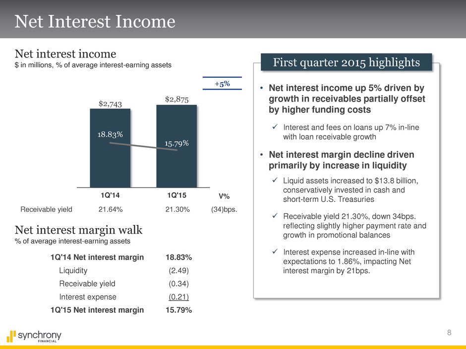 7 Financial Results Summary earnings statement First quarter 2015 highlights $ in millions, except ratios Total interest income $3,150 $2,933 $217 7% Total interest expense 275 190 (85) (45)% Net interest income (NII) 2,875 2,743 132 5% Retailer share arrangements (RSA) (660) (594) (66) (11)% NII, after RSA 2,215 2,149 66 3% Provision for loan losses 687 764 77 10% Other income 101 115 (14) (12)% Other expense 746 610 (136) (22)% Pre-Tax earnings 883 890 (7) (1)% Provision for income taxes 331 332 1 0% Net earnings $552 $558 $(6) (1)% Return on assets 3.0% 3.9% (0.9)pts. 1Q'15 1Q'14 % $ B/(W) • $552 million Net earnings, 3.0% ROA • Net interest income up 5% driven by growth in loan receivables Interest and fees on loan receivables up 7% in-line with receivable growth Interest expense increase driven by liquidity, funding mix and growth • Provision for loan losses declined 10% Asset quality improved … 30+ delinquencies down 30bps. and NCO rate down 33bps. vs. prior year • Other income declined 12% Increased loyalty partially offset with interchange due to program growth • Other expense in-line with expectations Other expense increase primarily driven by infrastructure build and growth