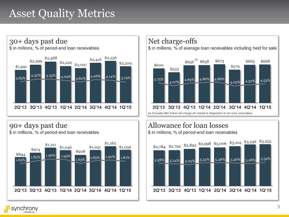 8 Net Interest Income First quarter 2015 highlights • Net interest income up 5% driven by growth in receivables partially offset by higher funding costs Interest and fees on loans up 7% in-line with loan receivable growth • Net interest margin decline driven primarily by increase in liquidity Liquid assets increased to $13.8 billion, conservatively invested in cash and short-term U.S. Treasuries Receivable yield 21.30%, down 34bps. reflecting slightly higher payment rate and growth in promotional balances Interest expense increased in-line with expectations to 1.86%, impacting Net interest margin by 21bps. Net interest income $ in millions, % of average interest-earning assets 18.83% 15.79% 1Q'14 1Q'15 +5% $2,743 $2,875 Receivable yield 21.64% 21.30% (34)bps. 1Q'14 Net interest margin 18.83% Liquidity (2.49) Receivable yield (0.34) Interest expense (0.21) 1Q'15 Net interest margin 15.79% V% Net interest margin walk % of average interest-earning assets