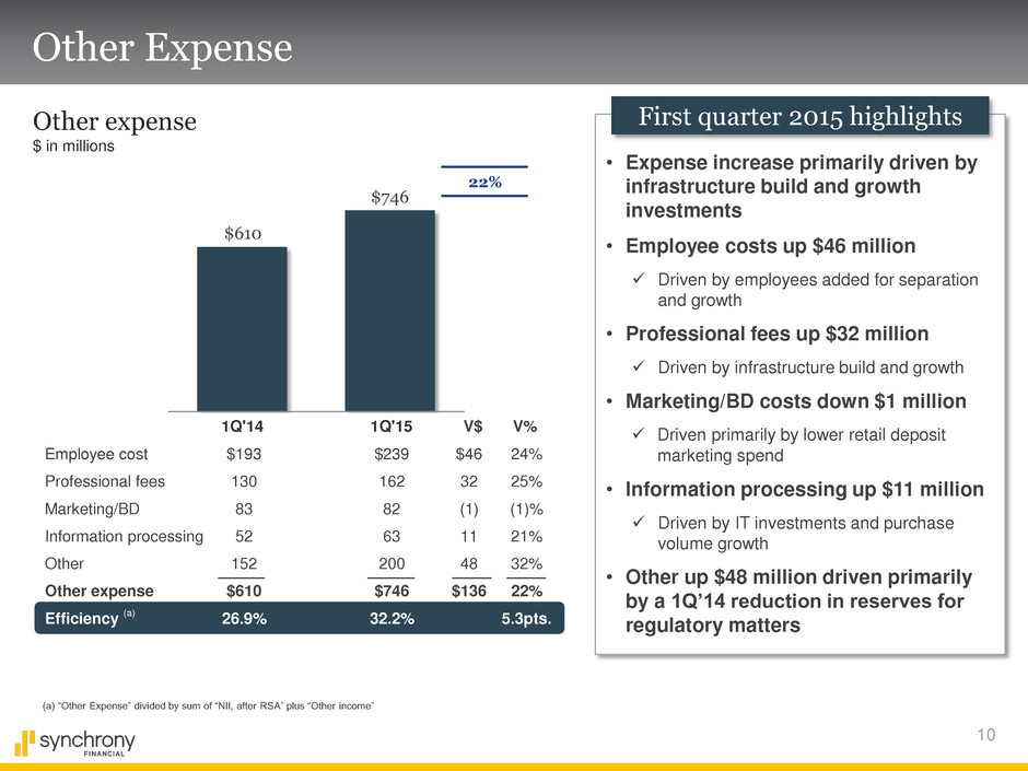 9 Asset Quality Metrics Net charge-offs $ in millions, % of average loan receivables including held for sale 30+ days past due $ in millions, % of period-end loan receivables Allowance for loan losses $ in millions, % of period-end loan receivables 90+ days past due $ in millions, % of period-end loan receivables 4.32% 4.26% 5.24% 5.46% 4.07% 4.88% $974 $1,051 3Q’13 3Q’14 $2,299 $2,416 $533 $673 $2,792 $3,102 1.83% 1.85% 4.86% 4.69% $656 4.05% $579 $658 5.48% $3,006 5.52% $2,998 5.05% $2,892 3.82% $2,097 4.09% $2,220 4.35% $2,488 $908 1.65% $1,046 1.93% $1,121 1.96% 4Q’13 1Q’14 2Q’14 3Q’13 3Q’14 4Q’13 1Q’14 2Q’14 3Q’13 3Q’14 4Q’13 1Q’14 2Q’14 3Q’13 3Q’14 4Q’13 1Q’14 2Q’14 4.75% $600 2Q’13 5.38% $2,784 2Q’13 3.85% $1,991 2Q’13 $844 2Q’13 1.63% (a) Excludes $62 million net charge-off related to disposition of non-core receivables (a) 4.14% $2,536 4Q’14 $1,162 4Q’14 1.90% 5.28% $3,236 4Q’14 4.32% $663 4Q’14 3.79% $2,209 1Q’15 $1,056 1Q’15 1.81% 5.59% $3,255 1Q’15 4.53% $668 1Q’15