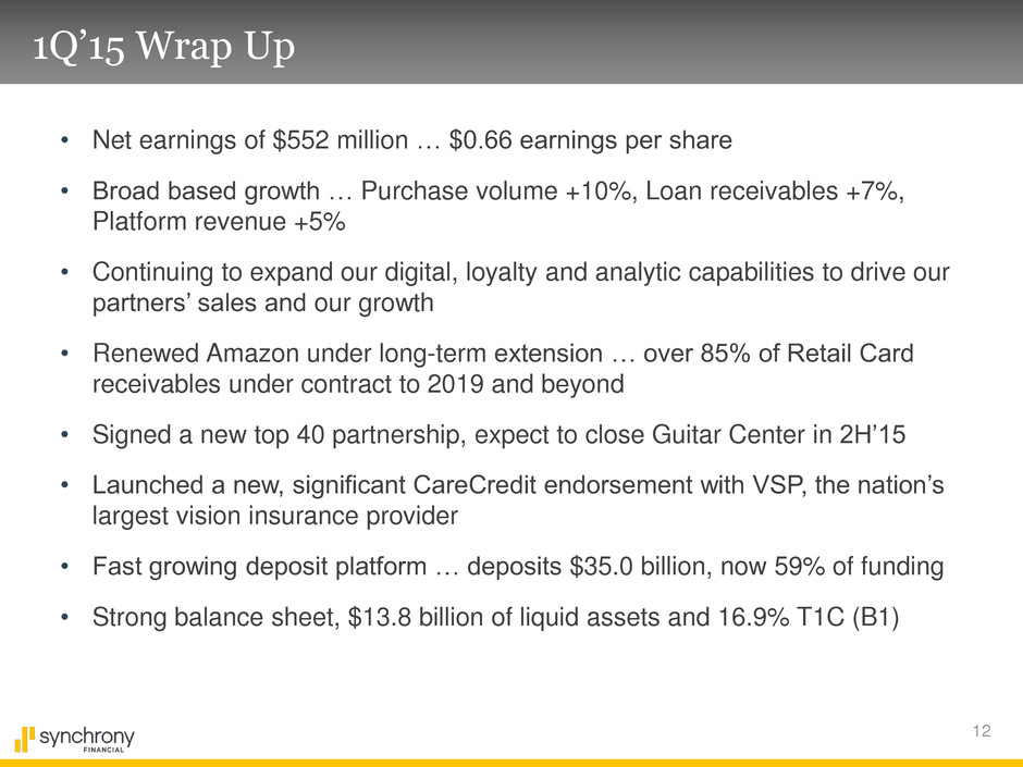 11 Funding, Capital and Liquidity (b) Liquid assets $4.8 $13.8 Undrawn securitization capacity 0.5 6.6 Total liquidity $5.3 $20.4 % of total assets 8.9% 28.1% Tier 1 common $9.8 $9.8 Risk weighted assets $58.2 $59.9 Liquidity $ in billions 1Q'15 $20.4 $5.3 1Q'14 Capital ratios 1Q'15, $ in billions BI T1C % (c) Does not include unencumbered assets in the Bank that could be pledged (c) BIII CET1 % (a) Estimated percentages and amounts (b) Calculated on a fully phased-in Basel III basis 16.9% 16.4% Funding sources $ in billions 1Q'14 1Q'15 Variance Deposits 55% 59% +4pts. Securitization 29% 24% (5)pts. GE Capital loan 16% - (16)pts. 3rd Party Debt - 17% +17pts. $50.1 $59.0 Deposits Securitization GECC Loan 3rd Party Debt $27.4 $14.6 $8.1 $35.0 $13.8 $10.2 V$ +10.2 (0.8) +7.6 (a)