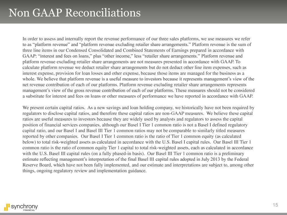 15 Non GAAP Reconciliations In order to assess and internally report the revenue performance of our three sales platforms, we use measures we refer to as “platform revenue” and “platform revenue excluding retailer share arrangements.” Platform revenue is the sum of three line items in our Condensed Consolidated and Combined Statements of Earnings prepared in accordance with GAAP: “interest and fees on loans,” plus “other income,” less “retailer share arrangements.” Platform revenue and platform revenue excluding retailer share arrangements are not measures presented in accordance with GAAP. To calculate platform revenue we deduct retailer share arrangements but do not deduct other line item expenses, such as interest expense, provision for loan losses and other expense, because those items are managed for the business as a whole. We believe that platform revenue is a useful measure to investors because it represents management’s view of the net revenue contribution of each of our platforms. Platform revenue excluding retailer share arrangements represents management’s view of the gross revenue contribution of each of our platforms. These measures should not be considered a substitute for interest and fees on loans or other measures of performance we have reported in accordance with GAAP. We present certain capital ratios. As a new savings and loan holding company, we historically have not been required by regulators to disclose capital ratios, and therefore these capital ratios are non-GAAP measures. We believe these capital ratios are useful measures to investors because they are widely used by analysts and regulators to assess the capital position of financial services companies, although our Basel I Tier 1 common ratio is not a Basel I defined regulatory capital ratio, and our Basel I and Basel III Tier 1 common ratios may not be comparable to similarly titled measures reported by other companies. Our Basel I Tier 1 common ratio is the ratio of Tier 1 common equity (as calculated below) to total risk-weighted assets as calculated in accordance with the U.S. Basel I capital rules. Our Basel III Tier 1 common ratio is the ratio of common equity Tier 1 capital to total risk-weighted assets, each as calculated in accordance with the U.S. Basel III capital rules (on a fully phased-in basis). Our Basel III Tier 1 common ratio is a preliminary estimate reflecting management’s interpretation of the final Basel III capital rules adopted in July 2013 by the Federal Reserve Board, which have not been fully implemented, and our estimate and interpretations are subject to, among other things, ongoing regulatory review and implementation guidance.