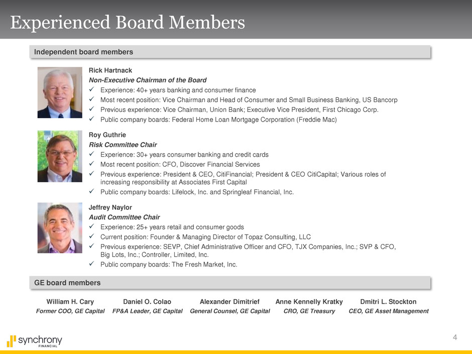 3 Experienced Management Team Brian D. Doubles Chief Financial Officer, Synchrony Financial CFO since January 2009 Global FP&A leader, GE Consumer Finance CEO & CFO, GE’s WMC mortgage business Various other leadership roles at GE Margaret M. Keane President & CEO, Synchrony Financial CEO since April 2011 CEO, Retail Card SVP, GE Consumer Finance Various leadership roles at Citicorp Henry F. Greig Chief Risk Officer, Synchrony Financial CRO since October 2010 CRO, GE Retail Card VP Risk, GE N.A. Retail Finance business Various other leadership roles at GE Eric Duenwald Treasurer, Synchrony Financial Deputy Treasurer since April 2014 Deputy Treasurer, GE Treasury COO, CIO, CFO GE Treasury Various other leadership roles at GE