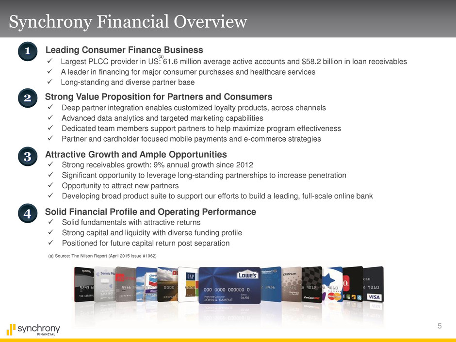 4 Experienced Board Members Independent board members Jeffrey Naylor Audit Committee Chair Experience: 25+ years retail and consumer goods Current position: Founder & Managing Director of Topaz Consulting, LLC Previous experience: SEVP, Chief Administrative Officer and CFO, TJX Companies, Inc.; SVP & CFO, Big Lots, Inc.; Controller, Limited, Inc. Public company boards: The Fresh Market, Inc. Rick Hartnack Non-Executive Chairman of the Board Experience: 40+ years banking and consumer finance Most recent position: Vice Chairman and Head of Consumer and Small Business Banking, US Bancorp Previous experience: Vice Chairman, Union Bank; Executive Vice President, First Chicago Corp. Public company boards: Federal Home Loan Mortgage Corporation (Freddie Mac) Roy Guthrie Risk Committee Chair Experience: 30+ years consumer banking and credit cards Most recent position: CFO, Discover Financial Services Previous experience: President & CEO, CitiFinancial; President & CEO CitiCapital; Various roles of increasing responsibility at Associates First Capital Public company boards: Lifelock, Inc. and Springleaf Financial, Inc. GE board members William H. Cary Former COO, GE Capital Daniel O. Colao FP&A Leader, GE Capital Alexander Dimitrief General Counsel, GE Capital Anne Kennelly Kratky CRO, GE Treasury Dmitri L. Stockton CEO, GE Asset Management