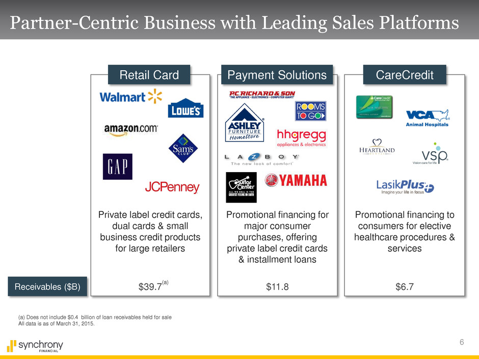 5 (a) Source: The Nilson Report (April 2015 Issue #1062) Synchrony Financial Overview Strong Value Proposition for Partners and Consumers 2 Deep partner integration enables customized loyalty products, across channels Advanced data analytics and targeted marketing capabilities Dedicated team members support partners to help maximize program effectiveness Partner and cardholder focused mobile payments and e-commerce strategies Attractive Growth and Ample Opportunities 3 Strong receivables growth: 9% annual growth since 2012 Significant opportunity to leverage long-standing partnerships to increase penetration Opportunity to attract new partners Developing broad product suite to support our efforts to build a leading, full-scale online bank Solid Financial Profile and Operating Performance 4 Solid fundamentals with attractive returns Strong capital and liquidity with diverse funding profile Positioned for future capital return post separation Leading Consumer Finance Business Largest PLCC provider in US: 61.6 million average active accounts and $58.2 billion in loan receivables A leader in financing for major consumer purchases and healthcare services Long-standing and diverse partner base (a) 1