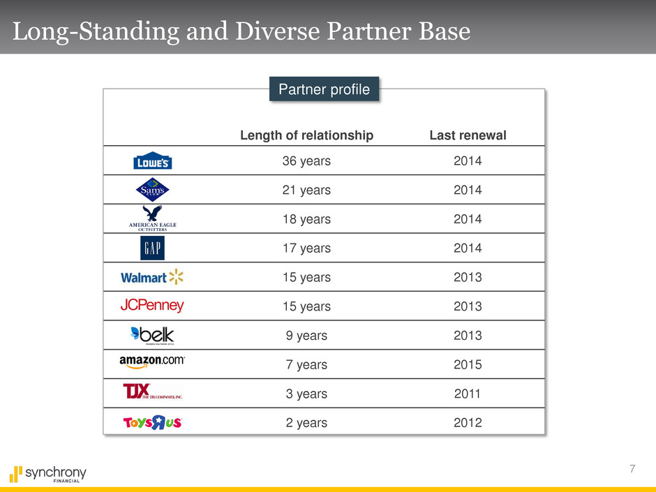6 Partner-Centric Business with Leading Sales Platforms Payment Solutions Retail Card CareCredit Private label credit cards, dual cards & small business credit products for large retailers Promotional financing for major consumer purchases, offering private label credit cards & installment loans Promotional financing to consumers for elective healthcare procedures & services Receivables ($B) (a) Does not include $0.4 billion of loan receivables held for sale All data is as of March 31, 2015. (a) $39.7 $11.8 $6.7
