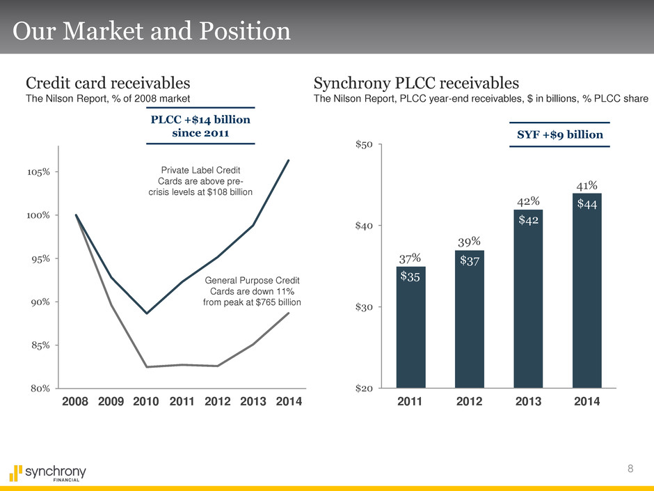 8 $20 $30 $40 $50 Our Market and Position Credit card receivables The Nilson Report, % of 2008 market 80% 85% 90% 95% 100% 105% Private Label Credit Cards are above pre- crisis levels at $108 billion General Purpose Credit Cards are down 11% from peak at $765 billion 2008 2009 2010 2011 2012 2013 Synchrony PLCC receivables The Nilson Report, PLCC year-end receivables, $ in billions, % PLCC share $42 $35 $37 SYF +$9 billion PLCC +$14 billion since 2011 2014 2011 2012 42% 37% 39% $44 41% 2014 2013