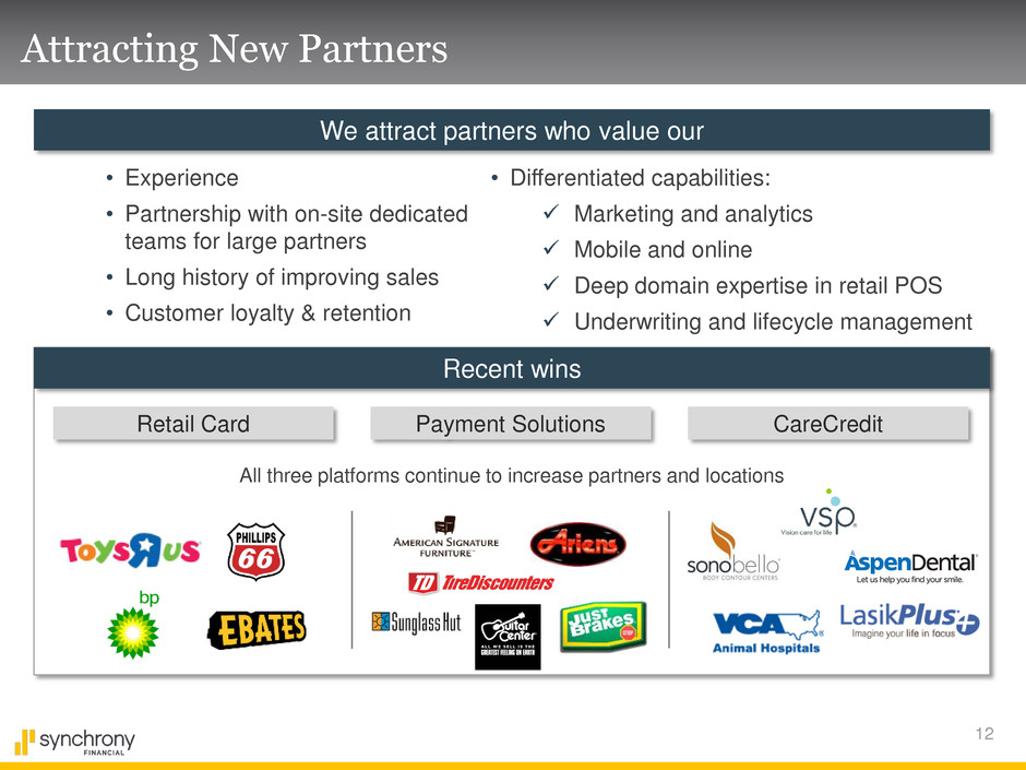 11 Partner Value Proposition We deliver significant savings and earnings to our partners No interchange fees for in-store purchases Retailer share arrangements enhance engagement Interchange savings Retailer share arrangements Margin on additional sales $2.6B ++ ++ $2.6B+ 2014 Economic benefits (a) Based on internal research (b) Metrics as of 12/31/2014 (c) Based on retailer reporting Engagement throughout customer lifecycle leads to loyalty and retention Retail Card customers average 7 year relationship 47% of CareCredit purchase volume from reuse of product by existing customers Customer Loyalty 1,000+ FTE dedicated to drive partner sales Dedicated on-site teams provide actionable insights Targeted marketing with advanced data analytics Enhanced marketing Purchase volume (c) Acquired retailer purchase volume as a % of prior issuer’s purchase volume Cardholders spend substantially more than non-cardholders Our purchase volume is growing faster than market Promotional financing influences big-ticket & healthcare spend Increased sales Purchase volume (a) Retailer A Retailer B Retailer C +43% +86% +39% +39% +82% Pre Acq. Year 1 Gray = non-cardholder Blue = cardholder Year 2 Year 3 Post Acquisition +115% (b)
