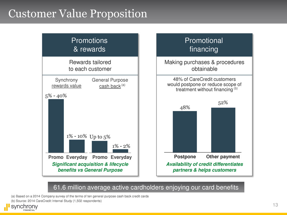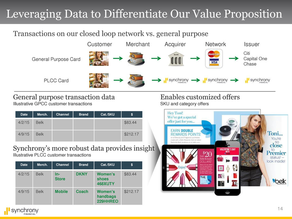 13 Availability of credit differentiates partners & helps customers Significant acquisition & lifecycle benefits vs General Purpose 61.6 million average active cardholders enjoying our card benefits Rewards tailored to each customer Making purchases & procedures obtainable Customer Value Proposition Other payment Postpone 48% 52% 48% of CareCredit customers would postpone or reduce scope of treatment without financing Promotions & rewards Promotional financing 5% - 40% 1% - 10% Synchrony rewards value Up to 5% 1% - 2% General Purpose cash back Promo Everyday (b) Source: 2014 CareCredit Internal Study (1,502 respondents) Promo Everyday (b) (a) Based on a 2014 Company survey of the terms of ten general purpose cash back credit cards (a)