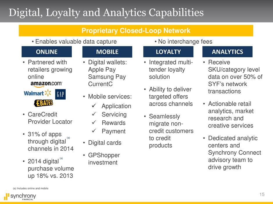 14 Leveraging Data to Differentiate Our Value Proposition Transactions on our closed loop network vs. general purpose Customer Merchant Acquirer Network Issuer General Purpose Card PLCC Card Date Merch. Channel Brand Cat./SKU $ 4/2/15 Belk In- Store DKNY Women’s shoes 468XUTY $83.44 4/9/15 Belk Mobile Coach Women’s handbags 229HHREO $212.17 Enables customized offers SKU and category offers Synchrony’s more robust data provides insight Illustrative PLCC customer transactions Date Merch. Channel Brand Cat./SKU $ 4/2/15 Belk $83.44 4/9/15 Belk $212.17 General purpose transaction data Illustrative GPCC customer transactions Citi Capital One Chase