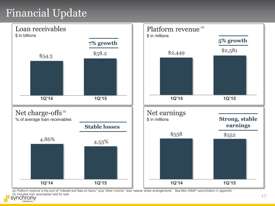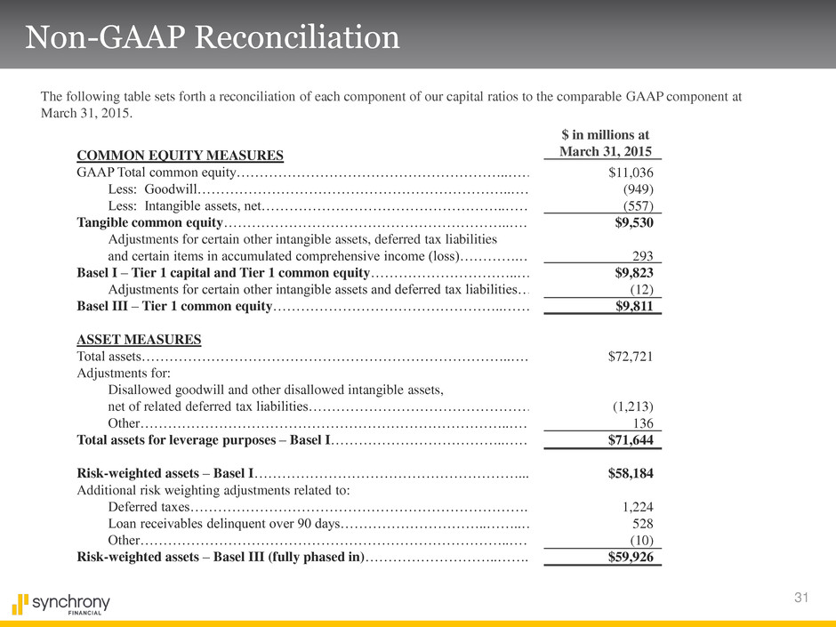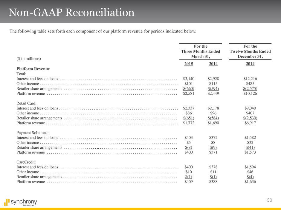 30 Non-GAAP Reconciliation The following table sets forth each component of our platform revenue for periods indicated below. ($ in millions) 2015 2014 2014 Platform Revenue Total: Interest and fees on loans . . . . . . . . . . . . . . . . . .. . . . . . . . . . . . . . . . . . . . . . . . . . . . . . . . . . . . . . . . . $3,140 $2,928 $12,216 Other income . . . . . . . . . . . . . . . . . . . . . . . . . . . .. . . . . . . . . . . . . . . . . . . . . . . . . . . . . . . . . . . . . . . . . $101 $115 $485 Retailer share arrangements . . . . . . . . . . . . . . . . . . . . . . . . . . . . . . . . . . . . . . . . . . . . . . . . . . . . . . . . . $(660) $(594) $(2,575) Platform revenue . . . . . . . . . . . . . . . . . . . . . . . . . . . . . . . . . . . . . . . . . . . . . . . . . . . . . . . . . . . . . . . . . $2,581 $2,449 $10,126 Retail Card: Interest and fees on loans . . . . . . . . . . . . . . . . . . .. . . . . . . . . . . . . . . . . . . . . . . . . . . . . . . . . . . . . . . . . $2,337 $2,178 $9,040 Other income . . . . . . . . . . . . . . . . . . . . . . . . . . . . . . . . . . . . . . . . . . . . . . . . . . . . . . . . . . . . . . . . . . . . $86 $96 $407 Retailer share arrangements . . . . . . . . . . . . . . . . .. . . . . . . . . . . . . . . . . . . . . . . . . . . . . . . . . . . . . . . . $(651) $(584) $(2,530) Platform revenue . . . . . . . . . . . . . . . . . . . . . . . . . .. . . . . . . . . . . . . . . . . . . . . . . . . . . . . . . . . . . . . . . . $1,772 $1,690 $6,917 Payment Solutions: Interest and fees on loans . . . . . . . . . . . . . . . . . . .. . . . . . . . . . . . . . . . . . . . . . . . . . . . . . . . . . . . . . . . . $403 $372 $1,582 Other income . . . . . . . . . . . . . . . . . . . . . . . . . . . . .. . . . . . . . . . . . . . . . . . . . . . . . . . . . . . . . . . . . . . . . . $5 $8 $32 Retailer share arrangements . . . . . . . . . . . . . . . . .. . . . . . . . . . . . . . . . . . . . . . . . . . . . . . . . . . . . . . . . . $(8) $(9) $(41) Platform revenue . . . . . . . . . . . . . . . . . . . . . . . . . . . . . . . . . . . . . . . . . . . . . . . . . . . . . . . . . . . . . . . . . . $400 $371 $1,573 CareCredit: Interest and fees on loans . . . . . . . . . . . . . . . . . . .. . . . . . . .. . . . . . . . . . . . . . . . . . . . . . . . . . . . . . . . . $400 $378 $1,594 Other income . . . . . . . . . . . . . . . . . . . . . . . . . . . . .. . . . . . . . . . . . . . . . . . . . . . . . . . . . . . . . . . . . . . . . . $10 $11 $46 Retailer share arrangements . . . . . . . . . . . . . . . . . . . . . . . . . . . . . . . . . . . . . . . . . . . . . . . . . . . . . . . . . . $(1) $(1) $(4) Platform revenue . . . . . . . . . . . . . . . . . . . . . . . . . . . . . . . . . . . . . . . . . . . . . . . . . . . . . . . . . . . . . . . . . . $409 $388 $1,636 For the Three Months Ended March 31, For the Twelve Months Ended December 31,