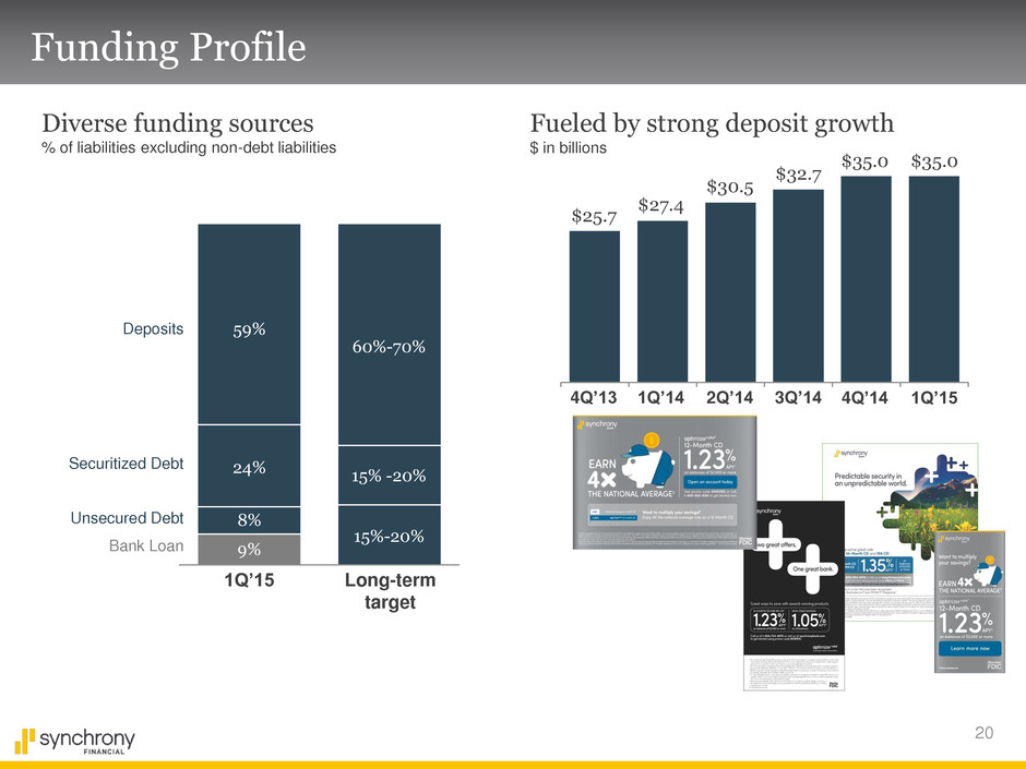 19 Credit Quality Overview Synchrony controls underwriting and credit line decisions Over 70% of assets at FICO greater than 660 Stronger portfolio U.S. consumer FICO Delinquency performance 30+ days delinquencies 4.22% 4.09% 3.79% 1Q’15 1Q’14 1Q’13 (a) (a) Prior to 3Q’12 a proprietary scoring model was used and converted to a FICO equivalent score 4.40% 1Q’12 19% 8% 20% 20% 61% 72% 601-660 661+ 2008 2014 ≤ 600