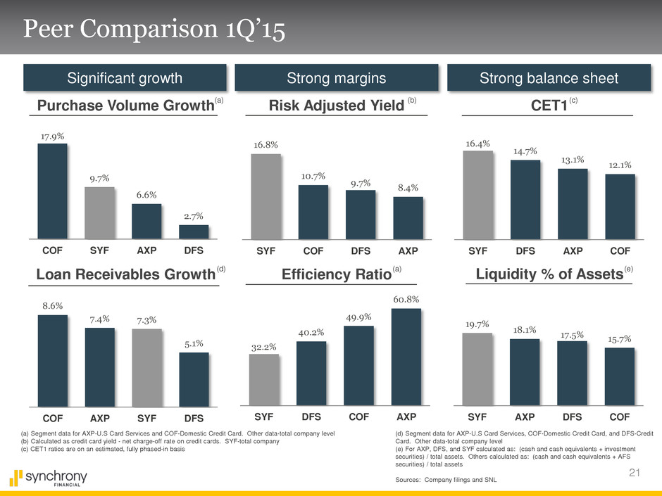 20 Funding Profile Deposits Securitized Debt Unsecured Debt 1Q’15 Long-term target 8% 59% 24% 15%-20% 60%-70% 15% -20% 9% Bank Loan Diverse funding sources % of liabilities excluding non-debt liabilities Fueled by strong deposit growth $ in billions 1Q’14 4Q’13 $25.7 $27.4 2Q’14 $30.5 3Q’14 $32.7 4Q’14 $35.0 1Q’15 $35.0