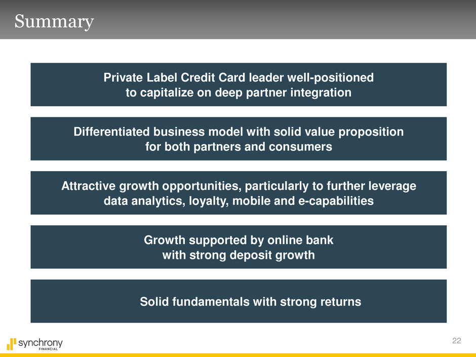 21 Peer Comparison 1Q’15 (a) Segment data for AXP-U.S Card Services and COF-Domestic Credit Card. Other data-total company level (b) Calculated as credit card yield - net charge-off rate on credit cards. SYF-total company (c) CET1 ratios are on an estimated, fully phased-in basis 32.2% 40.2% 49.9% 60.8% SYF DFS COF AXP Efficiency Ratio Risk Adjusted Yield 16.8% 10.7% 9.7% 8.4% SYF COF DFS AXP 17.9% 9.7% 6.6% 2.7% COF SYF AXP DFS Purchase Volume Growth Liquidity % of Assets 19.7% 18.1% 17.5% 15.7% SYF AXP DFS COF 16.4% 14.7% 13.1% 12.1% SYF DFS AXP COF CET1 (e) Strong margins Significant growth Strong balance sheet Loan Receivables Growth 8.6% 7.4% 7.3% 5.1% COF AXP SYF DFS (a) (d) (d) Segment data for AXP-U.S Card Services, COF-Domestic Credit Card, and DFS-Credit Card. Other data-total company level (e) For AXP, DFS, and SYF calculated as: (cash and cash equivalents + investment securities) / total assets. Others calculated as: (cash and cash equivalents + AFS securities) / total assets Sources: Company filings and SNL (c) (a) (b)