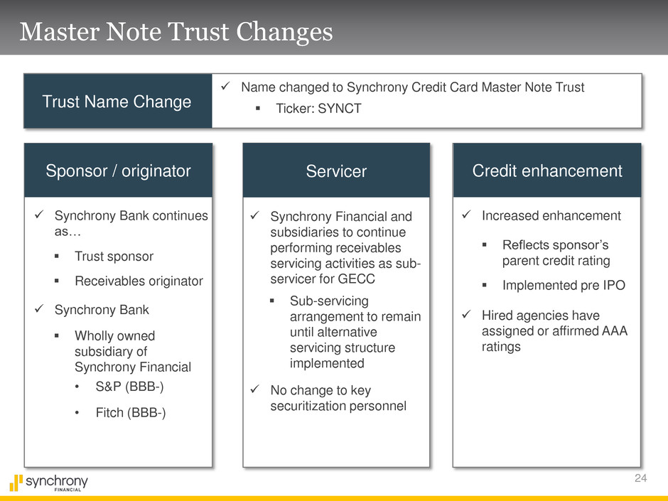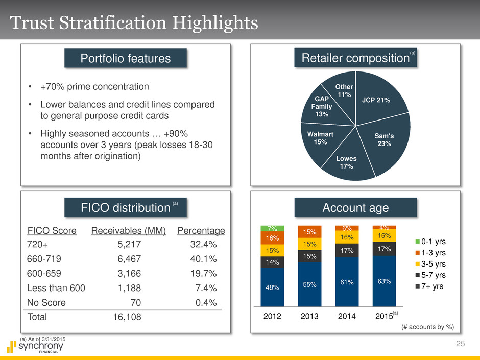 24 Master Note Trust Changes Sponsor / originator Credit enhancement Servicer Synchrony Bank continues as… Trust sponsor Receivables originator Synchrony Bank Wholly owned subsidiary of Synchrony Financial • S&P (BBB-) • Fitch (BBB-) Synchrony Financial and subsidiaries to continue performing receivables servicing activities as sub- servicer for GECC Increased enhancement Reflects sponsor’s parent credit rating Implemented pre IPO Hired agencies have assigned or affirmed AAA ratings Trust Name Change Name changed to Synchrony Credit Card Master Note Trust Ticker: SYNCT Sub-servicing arrangement to remain until alternative servicing structure implemented No change to key securitization personnel