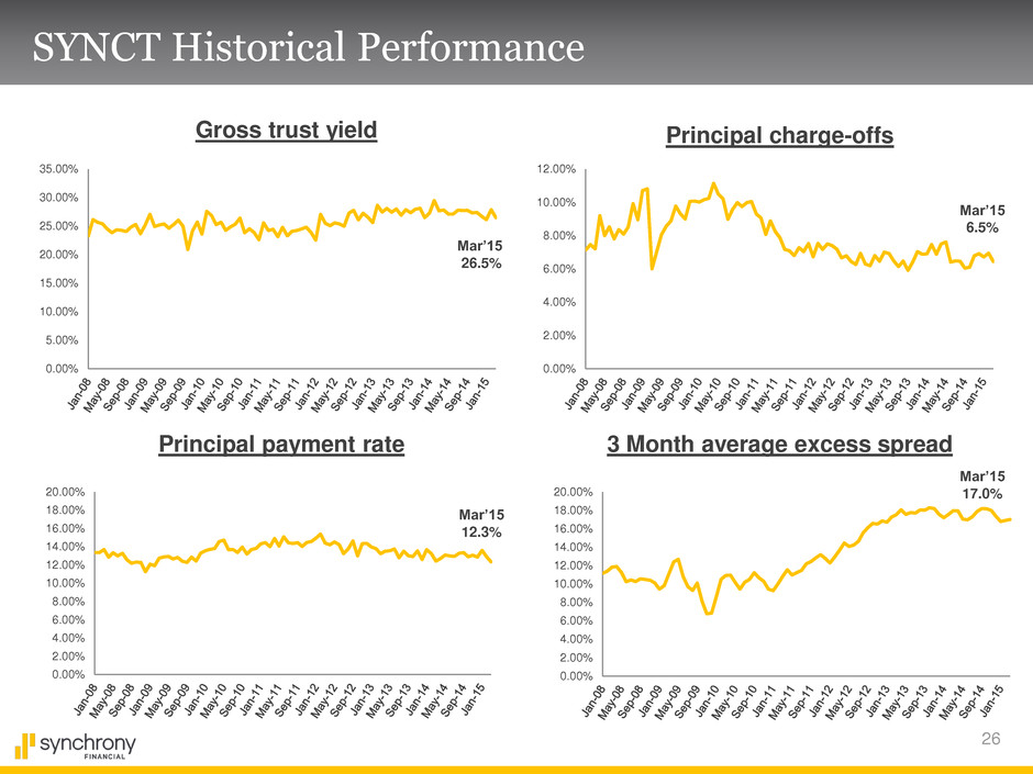 25 Trust Stratification Highlights • +70% prime concentration • Lower balances and credit lines compared to general purpose credit cards • Highly seasoned accounts … +90% accounts over 3 years (peak losses 18-30 months after origination) Portfolio features Retailer composition FICO distribution (a) FICO Score Total Receivables (MM) Percentage 16,108 Less than 600 1,188 7.4% 600-659 3,166 19.7% 660-719 6,467 40.1% 720+ 5,217 32.4% No Score 70 0.4% 48% 55% 61% 63% 14% 15% 17% 17% 15% 15% 16% 16% 16% 15% 6% 4% 7% 2012 2013 2014 2015 0-1 yrs 1-3 yrs 3-5 yrs 5-7 yrs 7+ yrs Account age (# accounts by %) JCP 21% Sam's 23% Lowes 17% Walmart 15% GAP Family 13% Other 11% (a) (a) As of 3/31/2015 (a)