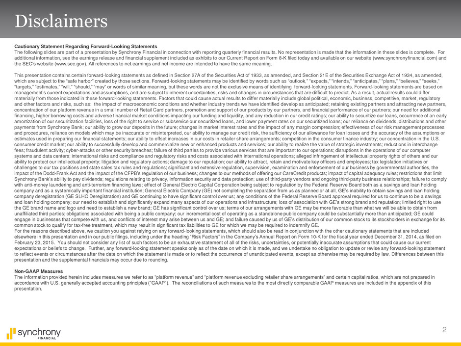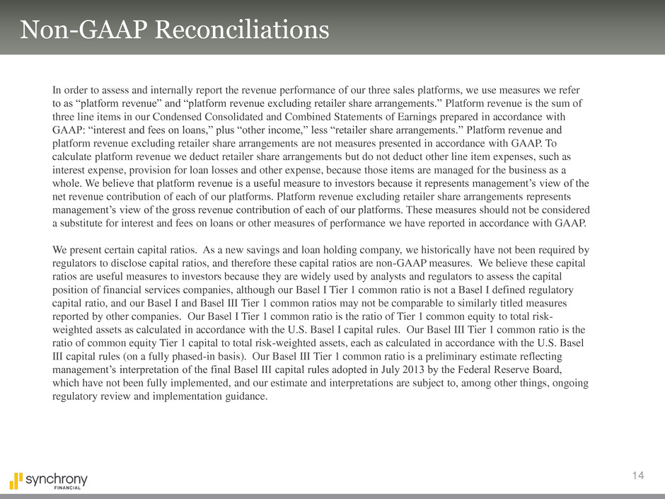 14 Non-GAAP Reconciliations In order to assess and internally report the revenue performance of our three sales platforms, we use measures we refer to as “platform revenue” and “platform revenue excluding retailer share arrangements.” Platform revenue is the sum of three line items in our Condensed Consolidated and Combined Statements of Earnings prepared in accordance with GAAP: “interest and fees on loans,” plus “other income,” less “retailer share arrangements.” Platform revenue and platform revenue excluding retailer share arrangements are not measures presented in accordance with GAAP. To calculate platform revenue we deduct retailer share arrangements but do not deduct other line item expenses, such as interest expense, provision for loan losses and other expense, because those items are managed for the business as a whole. We believe that platform revenue is a useful measure to investors because it represents management’s view of the net revenue contribution of each of our platforms. Platform revenue excluding retailer share arrangements represents management’s view of the gross revenue contribution of each of our platforms. These measures should not be considered a substitute for interest and fees on loans or other measures of performance we have reported in accordance with GAAP. We present certain capital ratios. As a new savings and loan holding company, we historically have not been required by regulators to disclose capital ratios, and therefore these capital ratios are non-GAAP measures. We believe these capital ratios are useful measures to investors because they are widely used by analysts and regulators to assess the capital position of financial services companies, although our Basel I Tier 1 common ratio is not a Basel I defined regulatory capital ratio, and our Basel I and Basel III Tier 1 common ratios may not be comparable to similarly titled measures reported by other companies. Our Basel I Tier 1 common ratio is the ratio of Tier 1 common equity to total risk- weighted assets as calculated in accordance with the U.S. Basel I capital rules. Our Basel III Tier 1 common ratio is the ratio of common equity Tier 1 capital to total risk-weighted assets, each as calculated in accordance with the U.S. Basel III capital rules (on a fully phased-in basis). Our Basel III Tier 1 common ratio is a preliminary estimate reflecting management’s interpretation of the final Basel III capital rules adopted in July 2013 by the Federal Reserve Board, which have not been fully implemented, and our estimate and interpretations are subject to, among other things, ongoing regulatory review and implementation guidance.