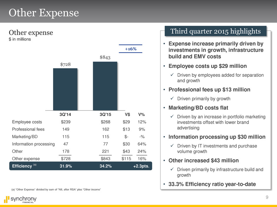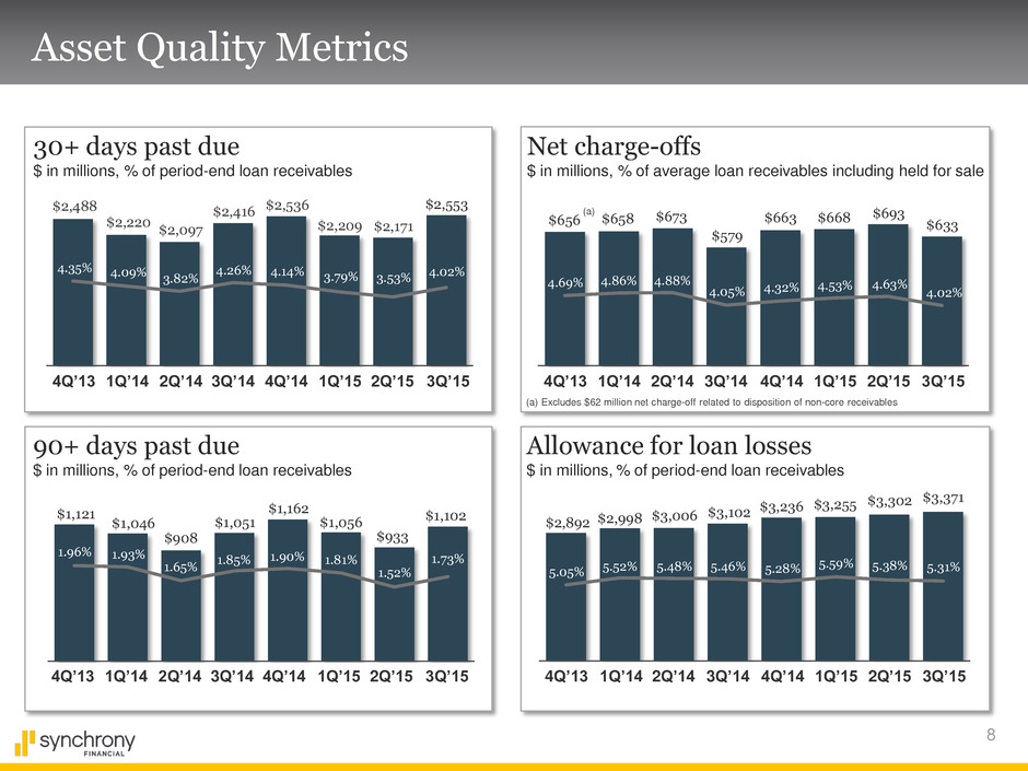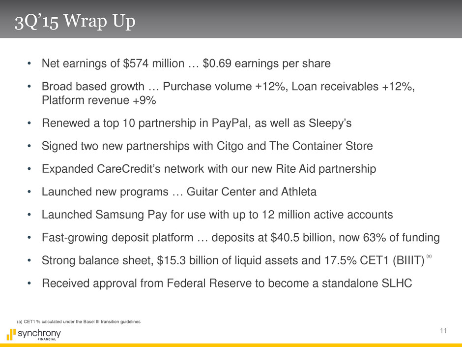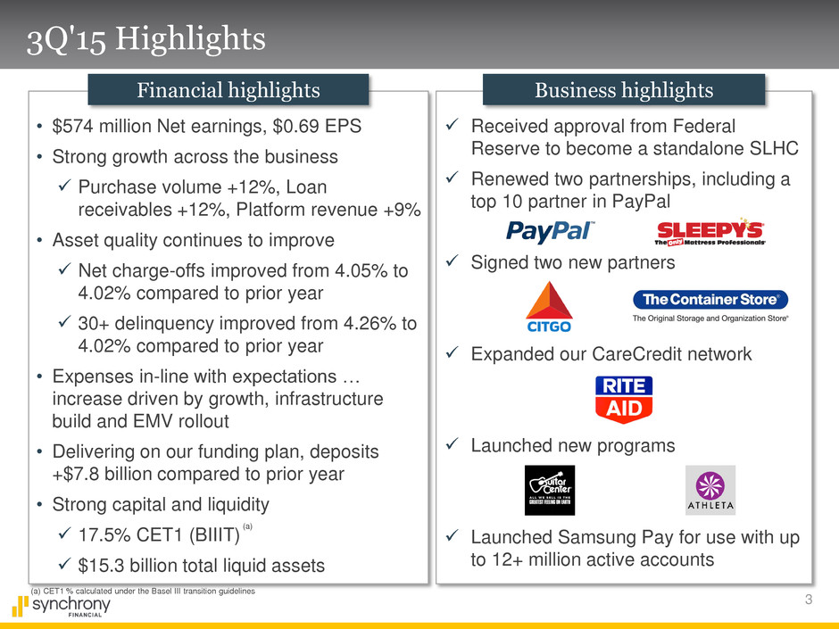 2 Cautionary Statement Regarding Forward-Looking Statements The following slides are part of a presentation by Synchrony Financial in connection with reporting quarterly financial results. No representation is made that the information in these slides is complete. For additional information, see the earnings release and financial supplement included as exhibits to our Current Report on Form 8-K filed today and available on our website (www.synchronyfinancial.com) and the SEC’s website (www.sec.gov). All references to net earnings and net income are intended to have the same meaning. This presentation contains certain forward-looking statements as defined in Section 27A of the Securities Act of 1933, as amended, and Section 21E of the Securities Exchange Act of 1934, as amended, which are subject to the “safe harbor” created by those sections. Forward-looking statements may be identified by words such as “outlook,” “expects,” “intends,” “anticipates,” “plans,” “believes,” “seeks,” “targets,” “estimates,” “will,” “should,” “may” or words of similar meaning, but these words are not the exclusive means of identifying forward-looking statements. Forward-looking statements are based on management’s current expectations and assumptions, and are subject to inherent uncertainties, risks and changes in circumstances that are difficult to predict. As a result, actual results could differ materially from those indicated in these forward-looking statements. Factors that could cause actual results to differ materially include global political, economic, business, competitive, market, regulatory and other factors and risks, such as: the impact of macroeconomic conditions and whether industry trends we have identified develop as anticipated; retaining existing partners and attracting new partners, concentration of our platform revenue in a small number of Retail Card partners, promotion and support of our products by our partners, and financial performance of our partners; our need for additional financing, higher borrowing costs and adverse financial market conditions impacting our funding and liquidity, and any reduction in our credit ratings; our ability to securitize our loans, occurrence of an early amortization of our securitization facilities, loss of the right to service or subservice our securitized loans, and lower payment rates on our securitized loans; our reliance on dividends, distributions and other payments from Synchrony Bank; our ability to grow our deposits in the future; changes in market interest rates and the impact of any margin compression; effectiveness of our risk management processes and procedures, reliance on models which may be inaccurate or misinterpreted, our ability to manage our credit risk, the sufficiency of our allowance for loan losses and the accuracy of the assumptions or estimates used in preparing our financial statements; our ability to offset increases in our costs in retailer share arrangements; competition in the consumer finance industry; our concentration in the U.S. consumer credit market; our ability to successfully develop and commercialize new or enhanced products and services; our ability to realize the value of strategic investments; reductions in interchange fees; fraudulent activity; cyber-attacks or other security breaches; failure of third parties to provide various services that are important to our operations; disruptions in the operations of our computer systems and data centers; international risks and compliance and regulatory risks and costs associated with international operations; alleged infringement of intellectual property rights of others and our ability to protect our intellectual property; litigation and regulatory actions; damage to our reputation; our ability to attract, retain and motivate key officers and employees; tax legislation initiatives or challenges to our tax positions and state sales tax rules and regulations; significant and extensive regulation, supervision, examination and enforcement of our business by governmental authorities, the impact of the Dodd-Frank Act and the impact of the CFPB’s regulation of our business; changes to our methods of offering our CareCredit products; impact of capital adequacy rules; restrictions that limit Synchrony Bank’s ability to pay dividends; regulations relating to privacy, information security and data protection; use of third-party vendors and ongoing third-party business relationships; failure to comply with anti-money laundering and anti-terrorism financing laws; effect of General Electric Capital Corporation being subject to regulation by the Federal Reserve Board both as a savings and loan holding company and as a systemically important financial institution; General Electric Company (GE) not completing the separation from us as planned or at all, GE’s inability to obtain savings and loan holding company deregistration (GE SLHC Deregistration) and GE continuing to have significant control over us; any conditions of the Federal Reserve Board approval required for us to continue to be a savings and loan holding company; our need to establish and significantly expand many aspects of our operations and infrastructure; loss of association with GE’s strong brand and reputation; limited right to use the GE brand name and logo and need to establish a new brand; GE has significant control over us; terms of our arrangements with GE may be more favorable than what we will be able to obtain from unaffiliated third parties; obligations associated with being a public company; our incremental cost of operating as a standalone public company could be substantially more than anticipated; GE could engage in businesses that compete with us, and conflicts of interest may arise between us and GE; and failure caused by us of GE’s distribution of our common stock to its stockholders in exchange for its common stock to qualify for tax-
