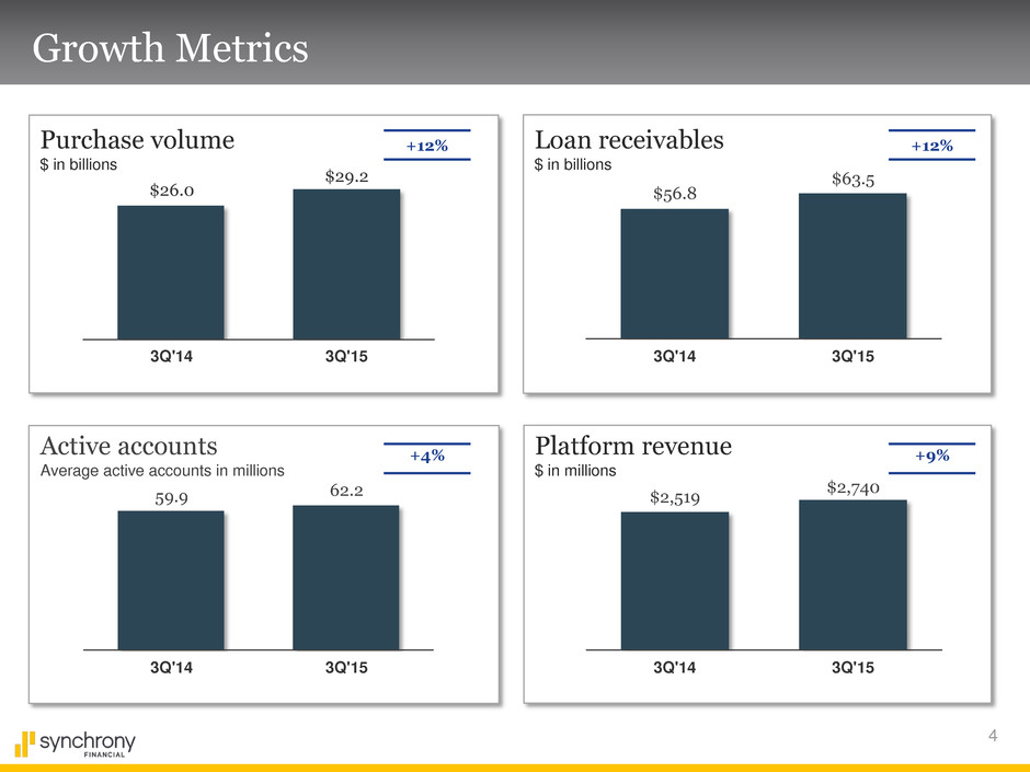 3 3Q'15 Highlights Financial highlights • $574 million Net earnings, $0.69 EPS • Strong growth across the business Purchase volume +12%, Loan receivables +12%, Platform revenue +9% • Asset quality continues to improve Net charge-offs improved from 4.05% to 4.02% compared to prior year 30+ delinquency improved from 4.26% to 4.02% compared to prior year • Expenses in-line with expectations … increase driven by growth, infrastructure build and EMV rollout • Delivering on our funding plan, deposits +$7.8 billion compared to prior year • Strong capital and liquidity 17.5% CET1 (BIIIT) $15.3 billion total liquid assets Business highlights Received approval from Federal Reserve to become a standalone SLHC Renewed two partnerships, including a top 10 partner in PayPal Signed two new partners Expanded our CareCredit network Launched new programs Launched Samsung Pay for use with up to 12+ million active accounts (a) (a) CET1 % calculated under the Basel III transition guidelines