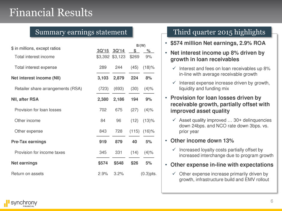 5 Platform Results Retail Card Loan receivables, $ in billions $38.5 $43.4 3Q'14 3Q'15 Strong receivable growth across partner programs Platform revenue up 10% driven by receivable growth Payment Solutions Loan receivables, $ in billions $11.5 $12.9 3Q'14 3Q'15 Broad receivable growth led by home furnishings and auto Platform revenue up 8% driven by receivable growth CareCredit Loan receivables, $ in billions $6.8 $7.2 3Q'14 3Q'15 Receivable growth led by dental and veterinary Platform revenue up 3% driven by receivable growth Purchase volume Accounts $21.0 48.4 $23.6 49.9 +12% +3% $3.2 6.9 $3.6 7.5 +13% +8% $1.8 4.6 $2.0 4.8 +13% +5% Platform revenue $1,694 $1,870 +10% $403 $434 +8% $422 $436 +3% +13% +12% +5% (a) a) Accounts represent average active accounts in millions, which are credit card or installment loan accounts on which there has been a purchase, payment or outstanding balance in the current month. Purchase volume $ in billions and Platform revenue $ in millions V% V% V%