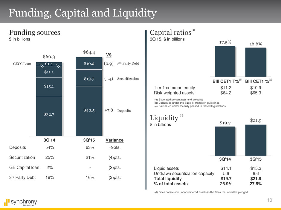 9 Other expense $ in millions Other Expense Employee costs $239 $268 $29 12% Professional fees 149 162 $13 9% Marketing/BD 115 115 $- -% Information processing 47 77 $30 64% Other 178 221 $43 24% Other expense $728 $843 $115 16% Efficiency 31.9% 34.2% +2.3pts. $728 • Expense increase primarily driven by investments in growth, infrastructure build and EMV costs • Employee costs up $29 million Driven by employees added for separation and growth • Professional fees up $13 million Driven primarily by growth • Marketing/BD costs flat Driven by an increase in portfolio marketing investments offset with lower brand advertising • Information processing up $30 million Driven by IT investments and purchase volume growth • Other increased $43 million Driven primarily by infrastructure build and growth • 33.3% Efficiency ratio year-to-date (a) “Other Expense” divided by sum of “NII, after RSA” plus “Other income” (1) V$ V% +16% (a) $843 3Q'14 3Q'15 Third quarter 2015 highlights