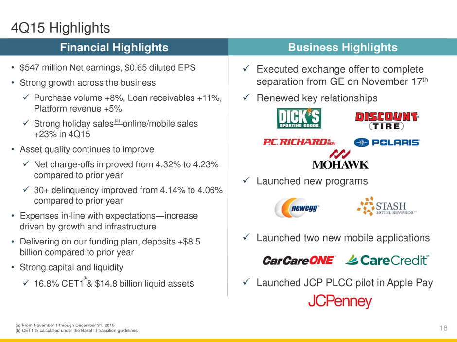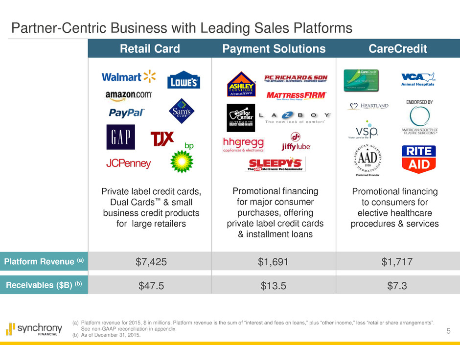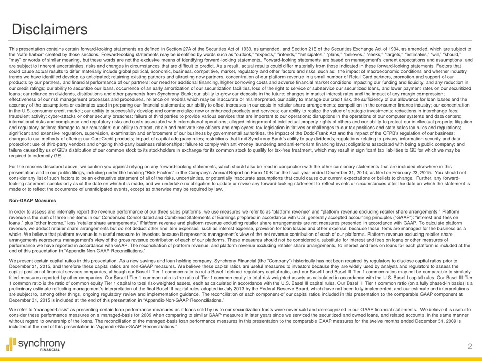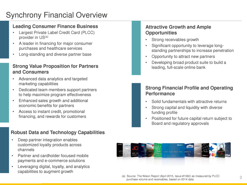 2 This presentation contains certain forward-looking statements as defined in Section 27A of the Securities Act of 1933, as amended, and Section 21E of the Securities Exchange Act of 1934, as amended, which are subject to the “safe harbor” created by those sections. Forward-looking statements may be identified by words such as “outlook,” “expects,” “intends,” “anticipates,” “plans,” “believes,” “seeks,” “targets,” “estimates,” “will,” “should,” “may” or words of similar meaning, but these words are not the exclusive means of identifying forward-looking statements. Forward-looking statements are based on management’s current expectations and assumptions, and are subject to inherent uncertainties, risks and changes in circumstances that are difficult to predict. As a result, actual results could differ materially from those indicated in these forward-looking statements. Factors that could cause actual results to differ materially include global political, economic, business, competitive, market, regulatory and other factors and risks, such as: the impact of macroeconomic conditions and whether industry trends we have identified develop as anticipated; retaining existing partners and attracting new partners, concentration of our platform revenue in a small number of Retail Card partners, promotion and support of our products by our partners, and financial performance of our partners; our need for additional financing, higher borrowing costs and adverse financial market conditions impacting our funding and liquidity, and any reduction in our credit ratings; our ability to securitize our loans, occurrence of an early amortization of our securitization facilities, loss of the right to service or subservice our securitized loans, and lower payment rates on our securitized loans; our reliance on dividends, distributions and other payments from Synchrony Bank; our ability to grow our deposits in the future; changes in market interest rates and the impact of any margin compression; effectiveness of our risk management processes and procedures, reliance on models which may be inaccurate or misinterpreted, our ability to manage our credit risk, the sufficiency of our allowance for loan losses and the accuracy of the assumptions or estimates used in preparing our financial statements; our ability to offset increases in our costs in retailer share arrangements; competition in the consumer finance industry; our concentration in the U.S. consumer credit market; our ability to successfully develop and commercialize new or enhanced products and services; our ability to realize the value of strategic investments; reductions in interchange fees; fraudulent activity; cyber-attacks or other security breaches; failure of third parties to provide various services that are important to our operations; disruptions in the operations of our computer systems and data centers; international risks and compliance and regulatory risks and costs associated with international operations; alleged infringement of intellectual property rights of others and our ability to protect our intellectual property; litigation and regulatory actions; damage to our reputation; our ability to attract, retain and motivate key officers and employees; tax legislation initiatives or challenges to our tax positions and state sales tax rules and regulations; significant and extensive regulation, supervision, examination and enforcement of our business by governmental authorities, the impact of the Dodd-Frank Act and the impact of the CFPB’s regulation of our business; changes to our methods of offering our CareCredit products; impact of capital adequacy rules; restrictions that limit Synchrony Bank’s ability to pay dividends; regulations relating to privacy, information security and data protection; use of third-party vendors and ongoing third-party business relationships; failure to comply with anti-money laundering and anti-terrorism financing laws; obligations associated with being a public company; and failure caused by us of GE’s distribution of our common stock to its stockholders in exchange for its common stock to qualify for tax-free treatment, which may result in significant tax liabilities to GE for which we may be required to indemnify GE. For the reasons described above, we caution you against relying on any forward-looking statements, which should also be read in conjunction with the other cautionary statements that are included elsewhere in this presentation and in our public filings, including under the heading “Risk Factors” in the Company’s Annual Report on Form 10-K for the fiscal year ended December 31, 2014, as filed on February 23, 2015. You should not consider any list of such factors to be an exhaustive statement of all of the risks, uncertainties, or potentially inaccurate assumptions that could cause our current expectations or beliefs to change. Further, any forward- looking statement speaks only as of the date on which it is made, and we undertake no obligation to update or revise any forward-looking statement to reflect events or circumstances after the date on which the statement is made or to reflect the occurrence of unanticipated events, except as otherwise may be required by law. Non-GAAP Measures In order to assess and internally report the revenue performance of our three sales platforms, we use measures we refer to as “platform revenue" and “platform revenue excluding retailer share arrangements.” Platform revenue is the sum of three line items in our Condensed Consolidated and Combined Statements of Earnings prepared in accordance with U.S. generally accepted accounting principles ("GAAP"): “interest and fees on loans,” plus “other income,” less “retailer share arrangements.” Platform revenue and platform revenue excluding retailer share arrangements are not measures presented in accordance with GAAP. To calculate platform 