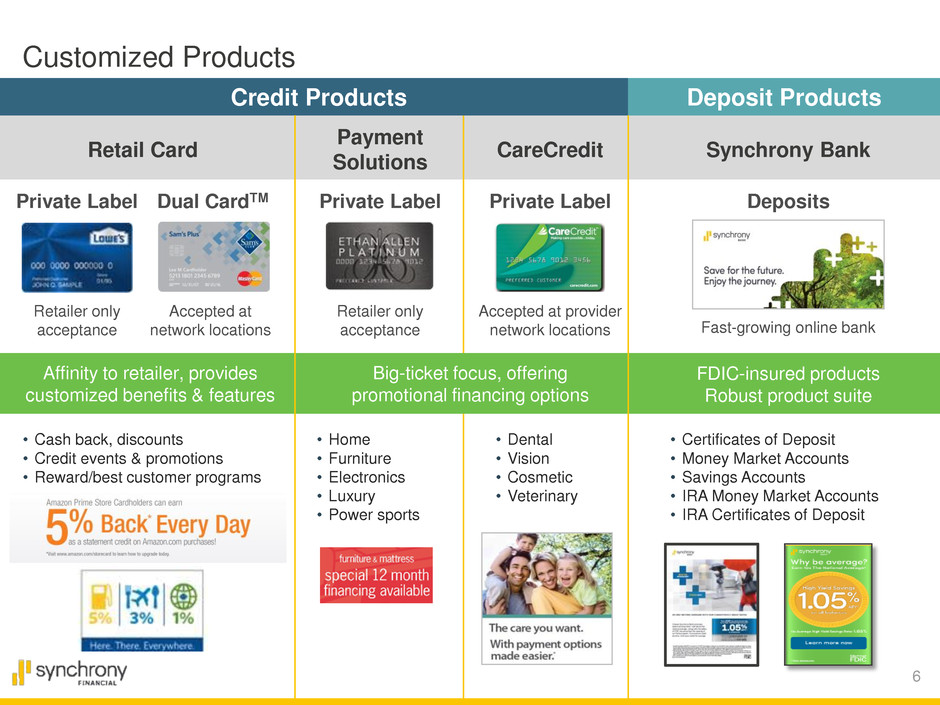 5 Partner-Centric Business with Leading Sales Platforms (a) Platform revenue for 2015, $ in millions. Platform revenue is the sum of “interest and fees on loans,” plus “other income,” less “retailer share arrangements”. See non-GAAP reconciliation in appendix. (b) As of December 31, 2015. $7,425 $47.5 $1,691 $13.5 $1,717 $7.3 Payment Solutions Retail Card CareCredit Platform Revenue (a) Receivables ($B) (b) Private label credit cards, Dual Cards™ & small business credit products for large retailers Promotional financing for major consumer purchases, offering private label credit cards & installment loans Promotional financing to consumers for elective healthcare procedures & services
