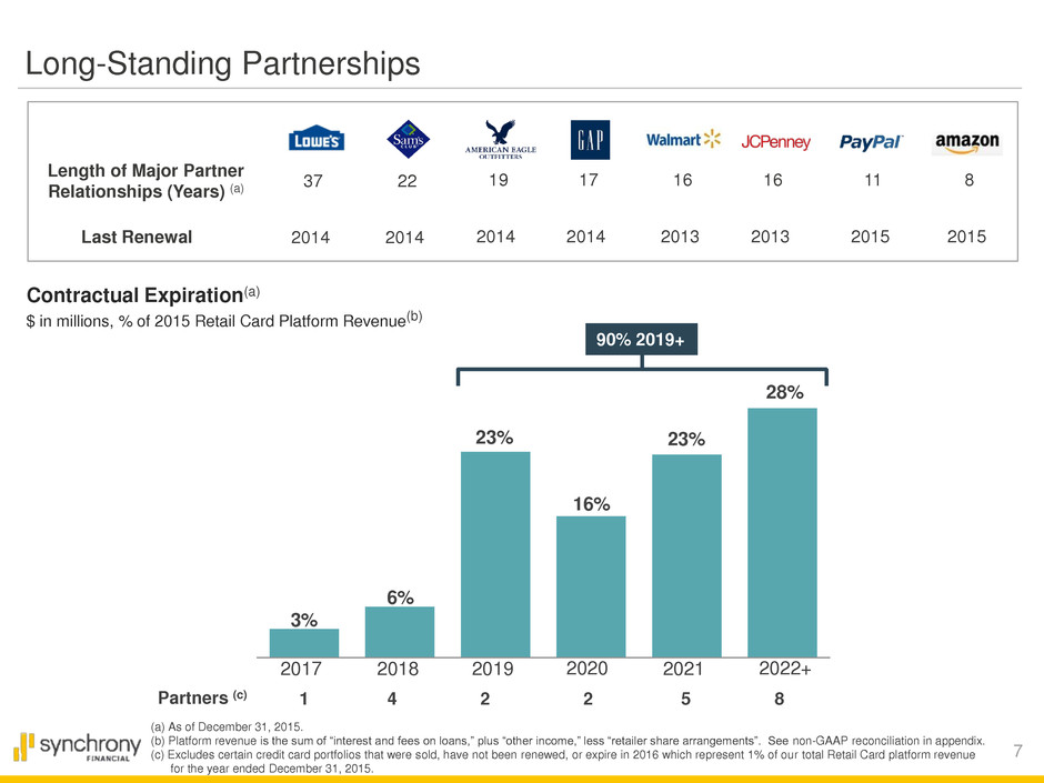 6 Customized Products Credit Products Retailer only acceptance Accepted at network locations Deposit Products Retailer only acceptance Accepted at provider network locations Private Label Dual CardTM Affinity to retailer, provides customized benefits & features Big-ticket focus, offering promotional financing options Retail Card Private Label Private Label • Dental • Vision • Cosmetic • Veterinary • Cash back, discounts • Credit events & promotions • Reward/best customer programs • Home • Furniture • Electronics • Luxury • Power sports Payment Solutions CareCredit Fast-growing online bank Deposits FDIC-insured products Robust product suite Synchrony Bank • Certificates of Deposit • Money Market Accounts • Savings Accounts • IRA Money Market Accounts • IRA Certificates of Deposit