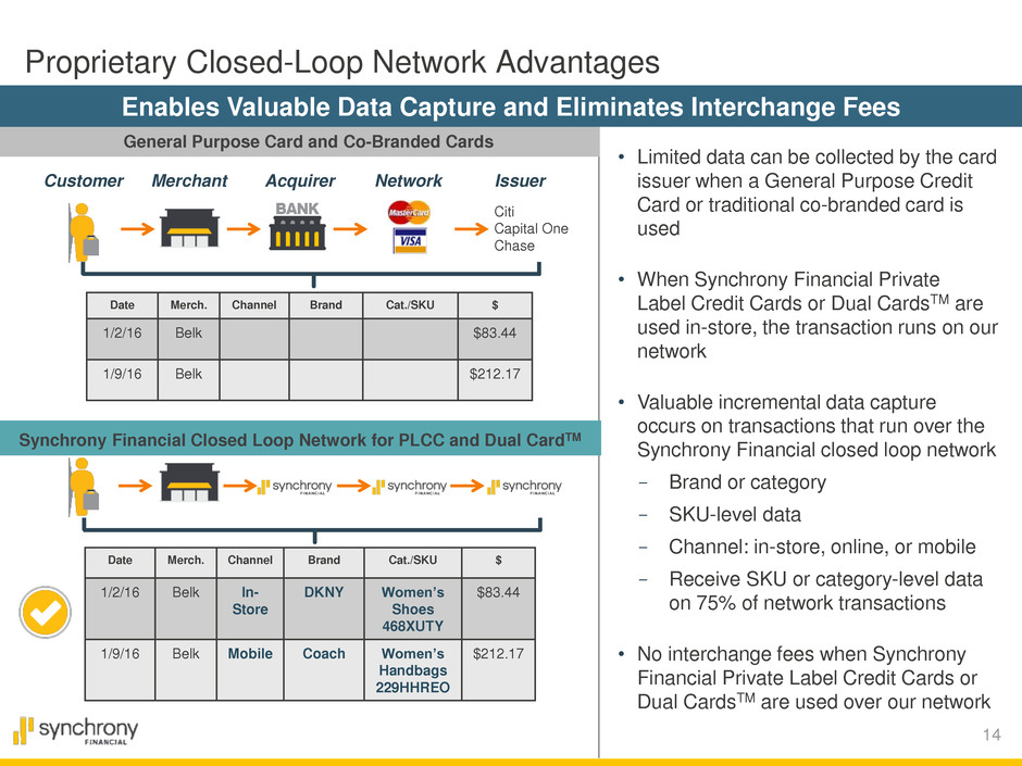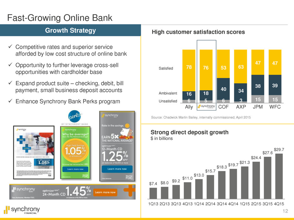 12 $7.4 $8.0 $9.2 $11.0 $13.0 $15.7 $18.3 $19.7 $21.3 $24.4 $27.6 $29.7 1Q13 2Q13 3Q13 4Q13 1Q14 2Q14 3Q14 4Q14 1Q15 2Q15 3Q15 4Q15 Growth Strategy Competitive rates and superior service afforded by low cost structure of online bank Opportunity to further leverage cross-sell opportunities with cardholder base Expand product suite – checking, debit, bill payment, small business deposit accounts Enhance Synchrony Bank Perks program High customer satisfaction scores Ally Source: Chadwick Martin Bailey, internally commissioned; April 2015 78 16 6 76 18 5 63 34 3 47 38 15 47 39 15 Satisfied Ambivalent Unsatisfied 53 40 6 AXP WFC JPM COF Strong direct deposit growth $ in billions Fast-Growing Online Bank