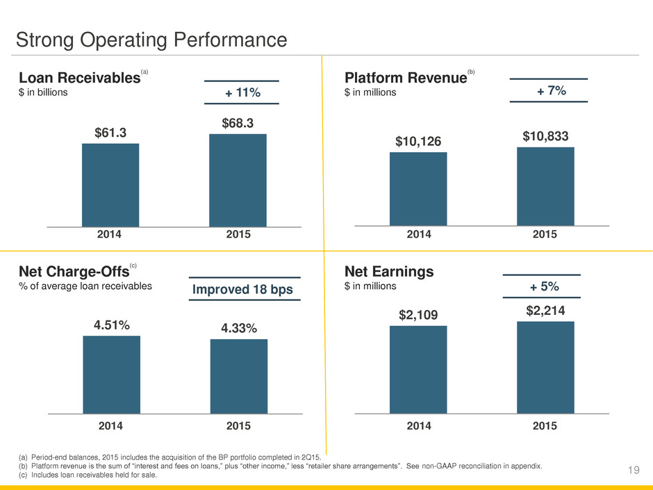 18 4Q15 Highlights Financial Highlights Business Highlights • $547 million Net earnings, $0.65 diluted EPS • Strong growth across the business Purchase volume +8%, Loan receivables +11%, Platform revenue +5% Strong holiday sales—online/mobile sales +23% in 4Q15 • Asset quality continues to improve Net charge-offs improved from 4.32% to 4.23% compared to prior year 30+ delinquency improved from 4.14% to 4.06% compared to prior year • Expenses in-line with expectations—increase driven by growth and infrastructure • Delivering on our funding plan, deposits +$8.5 billion compared to prior year • Strong capital and liquidity 16.8% CET1 & $14.8 billion liquid assets Launched two new mobile applications Launched JCP PLCC pilot in Apple Pay Executed exchange offer to complete separation from GE on November 17th Renewed key relationships Launched new programs (a) From November 1 through December 31, 2015 (b) CET1 % calculated under the Basel III transition guidelines (a) (b)
