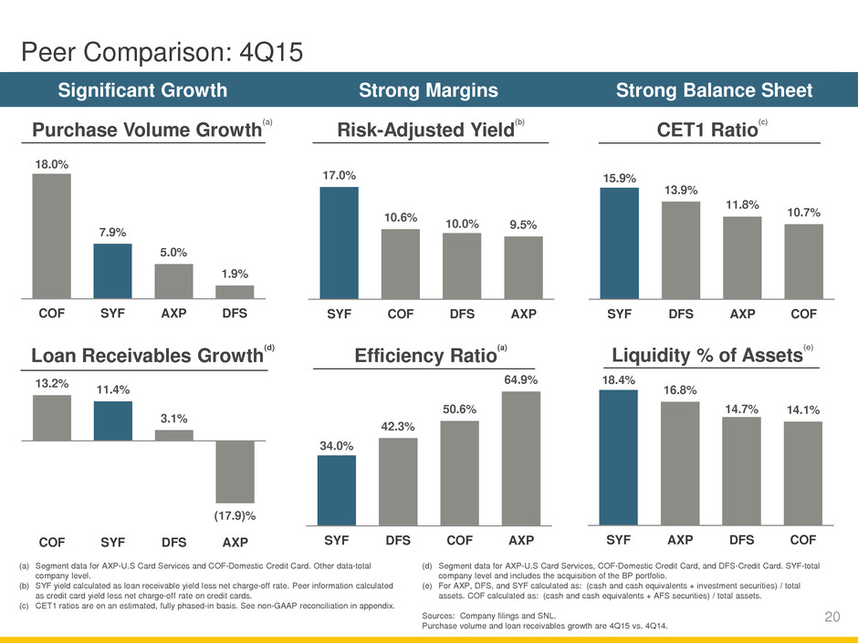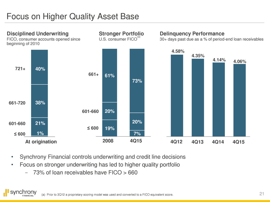 20 (a) Segment data for AXP-U.S Card Services and COF-Domestic Credit Card. Other data-total company level. (b) SYF yield calculated as loan receivable yield less net charge-off rate. Peer information calculated as credit card yield less net charge-off rate on credit cards. (c) CET1 ratios are on an estimated, fully phased-in basis. See non-GAAP reconciliation in appendix. 34.0% 42.3% 50.6% 64.9% SYF DFS COF AXP Efficiency Ratio (a) Risk-Adjusted Yield (b) 17.0% 10.6% 10.0% 9.5% SYF COF DFS AXP 18.0% 7.9% 5.0% 1.9% COF SYF AXP DFS Purchase Volume Growth (a) Liquidity % of Assets (e) 18.4% 16.8% 14.7% 14.1% SYF AXP DFS COF 15.9% 13.9% 11.8% 10.7% SYF DFS AXP COF CET1 Ratio (c) Strong Margins Significant Growth Strong Balance Sheet Loan Receivables Growth (d) 13.2% 11.4% 3.1% (17.9)% COF SYF DFS AXP (d) Segment data for AXP-U.S Card Services, COF-Domestic Credit Card, and DFS-Credit Card. SYF-total company level and includes the acquisition of the BP portfolio. (e) For AXP, DFS, and SYF calculated as: (cash and cash equivalents + investment securities) / total assets. COF calculated as: (cash and cash equivalents + AFS securities) / total assets. Sources: Company filings and SNL. Purchase volume and loan receivables growth are 4Q15 vs. 4Q14. Peer Comparison: 4Q15