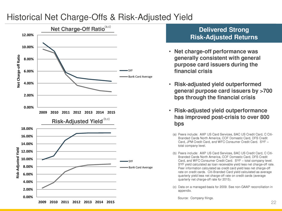 21 19% 7% 20% 20% 61% 73% • Synchrony Financial controls underwriting and credit line decisions • Focus on stronger underwriting has led to higher quality portfolio - 73% of loan receivables have FICO > 660 Stronger Portfolio U.S. consumer FICO (a) Delinquency Performance 30+ days past due as a % of period-end loan receivables 4.35% 4.14% 4.06% 4Q15 4Q14 4Q13 (a) Prior to 3Q12 a proprietary scoring model was used and converted to a FICO equivalent score. 4.58% 4Q12 601-660 661+ 2008 4Q15 ≤ 600 ≤ 600 601-660 661-720 721+ At origination Disciplined Underwriting FICO, consumer accounts opened since beginning of 2010 40% 38% 21% 1% Focus on Higher Quality Asset Base