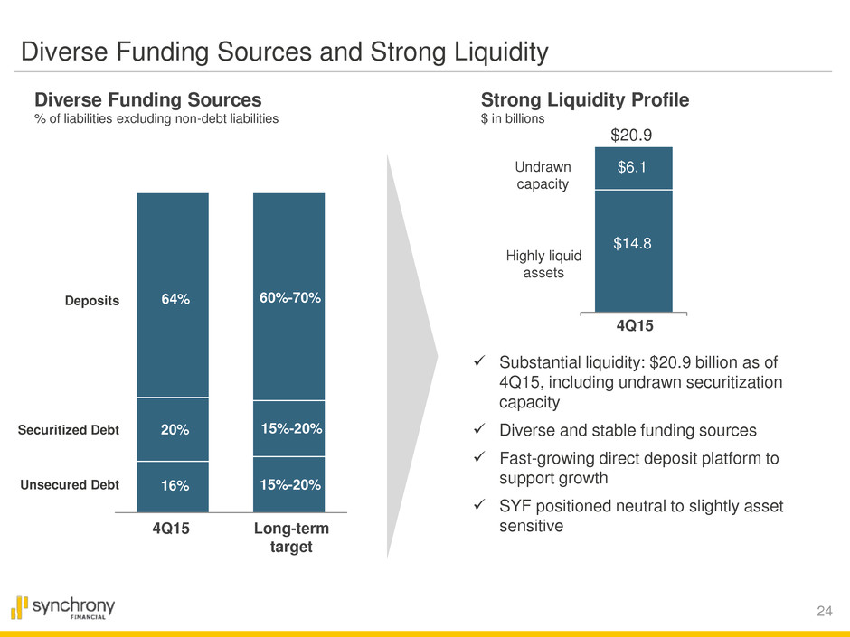 23 100% 50% 50% 1.5% 2.5% Total Program Return Shared Components Illustrative Examples Program Revenue • Interest Income • Fee Income • Interchange Fees Program Expenses • Interest Expense • Provision for Loan Losses • Loyalty Expense • Operating Expenses SYF Share of Return Retailer Share of Return 2.75% 1.25% 4.0% Total Program Return Allocation Provides a countercyclical buffer in stressed environments: 2015 RSAs were 4.4% of average loan receivables 2009 RSAs were 1.6% of average loan receivables(a) 100% 50% 50% 1.5% 1.0% Total Program Return 2.00% 0.50% 2.5% N orma l Lo w e r P rogr a m P e rf o rm a nc e Operating Environment Program Return (a) Loan receivables on a managed-basis in 2009. See non-GAAP reconciliation in appendix. Retailer Share Arrangements (RSA) SYF – 69% of Program Return SYF – 80% of Program Return