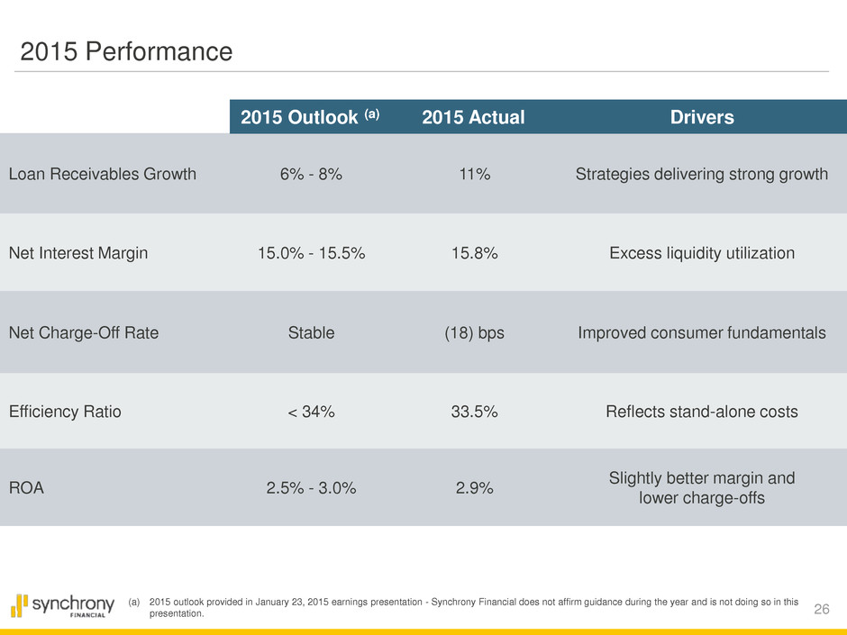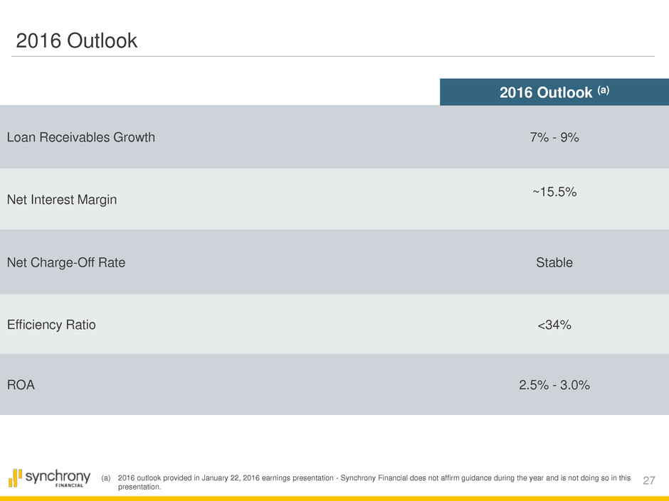 26 2015 Performance Loan Receivables Growth 6% - 8% 11% Strategies delivering strong growth Net Interest Margin 15.0% - 15.5% 15.8% Excess liquidity utilization Net Charge-Off Rate Stable (18) bps Improved consumer fundamentals Efficiency Ratio < 34% 33.5% Reflects stand-alone costs ROA 2.5% - 3.0% 2.9% Slightly better margin and lower charge-offs 2015 Outlook (a) 2015 Actual Drivers (a) 2015 outlook provided in January 23, 2015 earnings presentation - Synchrony Financial does not affirm guidance during the year and is not doing so in this presentation.