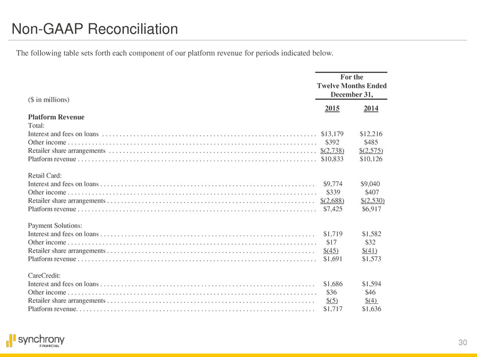 30 Non-GAAP Reconciliation The following table sets forth each component of our platform revenue for periods indicated below. ($ in millions) 2015 2014 Platform Revenue Total: Interest and fees on loans . . . . . . . . . . . . . . . . . . . . . . . . . . . . . . . . . . . . . . . . . . . . . . . . . . . . . . . . . . . . . . $13,179 $12,216 Other income . . . . . . . . . . . . . . . . . . . . . . . . . . . . . . . . . . . . . . . . . . . . . . . . . . . . . . . . . . . . . . . . . . . . . . . . $392 $485 Retailer share arrangements . . . . . . . . . . . . . . . . . . . . . . . . . . . . . . . . . . . . . . . . . . . . . . . . . . . . . . . . . . . . $(2,738) $(2,575) Platform revenue . . . . . . . . . . . . . . . . . . . . . . . . . . . . . . . . . . . . . . . . . . . . . . . . . . . . . . . . . . . . . . . . . . . . . $10,833 $10,126 Retail Card: Interest and fees on loans . . . . . . . . . . . . . . . . . . . . . . . . . . . . . . . . . . . . . . . . . . . . . . . . . . . . . . . . . . . . . . $9,774 $9,040 Other income . . . . . . . . . . . . . . . . . . . . . . . . . . . . . . . . . . . . . . . . . . . . . . . . . . . . . . . . . . . . . . . . . . . . . . . . $339 $407 Retailer share arrangements . . . . . . . . . . . . . . . . . . . . . . . . . . . . . . . . . . . . . . . . . . . . . . . . . . . . . . . . . . . . $(2,688) $(2,530) Platform revenue . . . . . . . . . . . . . . . . . . . . . . . . . . . . . . . . . . . . . . . . . . . . . . . . . . . . . . . . . . . . . . . . . . . . . $7,425 $6,917 Payment Solutions: Interest and fees on loans . . . . . . . . . . . . . . . . . . . . . . . . . . . . . . . . . . . . . . . . . . . . . . . . . . . . . . . . . . . . . . $1,719 $1,582 Other income . . . . . . . . . . . . . . . . . . . . . . . . . . . . . . . . . . . . . . . . . . . . . . . . . . . . . . . . . . . . . . . . . . . . . . . . $17 $32 Retailer share arrangements . . . . . . . . . . . . . . . . . . . . . . . . . . . . . . . . . . . . . . . . . . . . . . . . . . . . . . . . . . . . $(45) $(41) Platform revenue . . . . . . . . . . . . . . . . . . . . . . . . . . . . . . . . . . . . . . . . . . . . . . . . . . . . . . . . . . . . . . . . . . . . . $1,691 $1,573 CareCredit: Interest and fees on loans . . . . . . . . . . . . . . . . . . . . . . . . . . . . . . . . . . . . . . . . . . . . . . . . . . . . . . . . . . . . . . $1,686 $1,594 Other income . . . . . . . . . . . . . . . . . . . . . . . . . . . . . . . . . . . . . . . . . . . . . . . . . . . . . . . . . . . . . . . . . . . . . . . . $36 $46 Retailer share arrangements . . . . . . . . . . . . . . . . . . . . . . . . . . . . . . . . . . . . . . . . . . . . . . . . . . . . . . . . . . . . $(5) $(4) Platform revenue. . . . . . . . . . . . . . . . . . . . . . . . . . . . . . . . . . . . . . . . . . . . . . . . . . . . . . . . . . . . . . . . . . . . . $1,717 $1,636 For the Twelve Months Ended December 31,