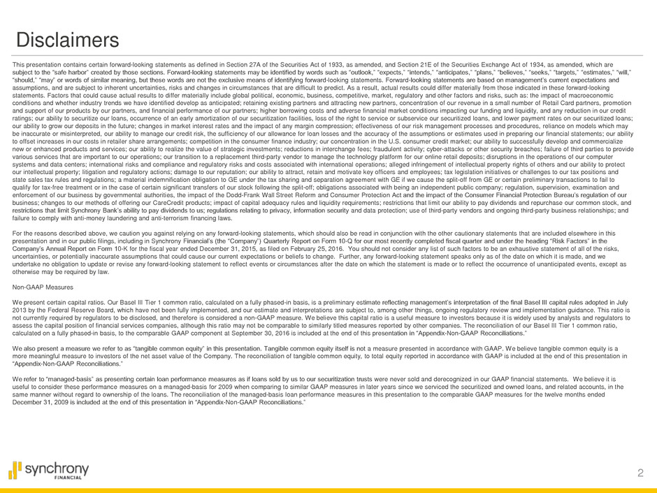 presentation and in our public filings, including in Synchrony Financial’s (the “Company”) Quarterly Report on Form 10-Q for our most recently completed fiscal quarter and under the heading “Risk Factors” in the