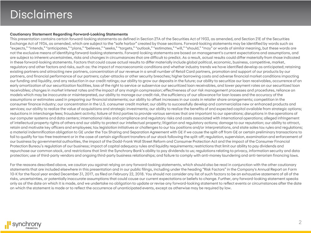 Disclaimers Cautionary Statement Regarding Forward-Looking Statements This presentation contains certain forward-looking statements as defined in Section 27A of the Securities Act of 1933, as amended, and Section 21E of the Securities Exchange Act of 1934, as amended, which are subject to the “safe harbor” created by those sections. Forward-looking statements may be identified by words such as “expects,” “intends,” “anticipates,” “plans,” “believes,” “seeks,” “targets,” “outlook,” “estimates,” “will,” “should,” “may” or words of similar meaning, but these words are not the exclusive means of identifying forward-looking statements. Forward-looking statements are based on management's current expectations and assumptions, and are subject to inherent uncertainties, risks and changes in circumstances that are difficult to predict. As a result, actual results could differ materially from those indicated in these forward-looking statements. Factors that could cause actual results to differ materially include global political, economic, business, competitive, market, regulatory and other factors and risks, such as: the impact of macroeconomic conditions and whether industry trends we have identified develop as anticipated; retaining existing partners and attracting new partners, concentration of our revenue in a small number of Retail Card partners, promotion and support of our products by our partners, and financial performance of our partners; cyber-attacks or other security breaches; higher borrowing costs and adverse financial market conditions impacting our funding and liquidity, and any reduction in our credit ratings; our ability to grow our deposits in the future; our ability to securitize our loan receivables, occurrence of an early amortization of our securitization facilities, loss of the right to service or subservice our securitized loan receivables, and lower payment rates on our securitized loan receivables; changes in market interest rates and the impact of any margin compression; effectiveness of our risk management processes and procedures, reliance on models which may be inaccurate or misinterpreted, our ability to manage our credit risk, the sufficiency of our allowance for loan losses and the accuracy of the assumptions or estimates used in preparing our financial statements; our ability to offset increases in our costs in retailer share arrangements; competition in the consumer finance industry; our concentration in the U.S. consumer credit market; our ability to successfully develop and commercialize new or enhanced products and services; our ability to realize the value of acquisitions and strategic investments; our ability to realize the benefits of and expected capital available from strategic options; reductions in interchange fees; fraudulent activity; failure of third parties to provide various services that are important to our operations; disruptions in the operations of our computer systems and data centers; international risks and compliance and regulatory risks and costs associated with international operations; alleged infringement of intellectual property rights of others and our ability to protect our intellectual property; litigation and regulatory actions; damage to our reputation; our ability to attract, retain and motivate key officers and employees; tax legislation initiatives or challenges to our tax positions and/or interpretations, and state sales tax rules and regulations; a material indemnification obligation to GE under the Tax Sharing and Separation Agreement with GE if we cause the split-off from GE or certain preliminary transactions to fail to qualify for tax-free treatment or in the case of certain significant transfers of our stock following the split-off; regulation, supervision, examination and enforcement of our business by governmental authorities, the impact of the Dodd-Frank Wall Street Reform and Consumer Protection Act and the impact of the Consumer Financial Protection Bureau’s regulation of our business; impact of capital adequacy rules and liquidity requirements; restrictions that limit our ability to pay dividends and repurchase our common stock, and restrictions that limit the Synchrony Bank’s ability to pay dividends to us; regulations relating to privacy, information security and data protection; use of third-party vendors and ongoing third-party business relationships; and failure to comply with anti-money laundering and anti-terrorism financing laws. For the reasons described above, we caution you against relying on any forward-looking statements, which should also be read in conjunction with the other cautionary statements that are included elsewhere in this presentation and in our public filings, including under the heading “Risk Factors” in the Company's Annual Report on Form 10-K for the fiscal year ended December 31, 2017, as filed on February 22, 2018. You should not consider any list of such factors to be an exhaustive statement of all of the risks, uncertainties, or potentially inaccurate assumptions that could cause our current expectations or beliefs to change. Further, any forward-looking statement speaks only as of the date on which it is made, and we undertake no obligation to update or revise any forward-looking statement to reflect events or circumstances after the date on which the statement is made or to reflect the occurrence of unanticipated events, except as otherwise may be required by law. 2