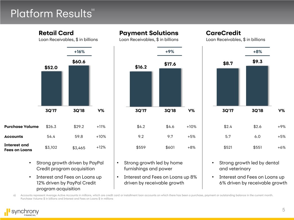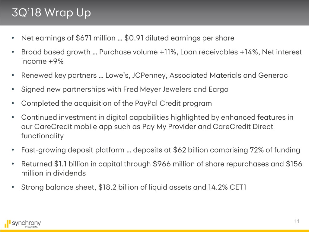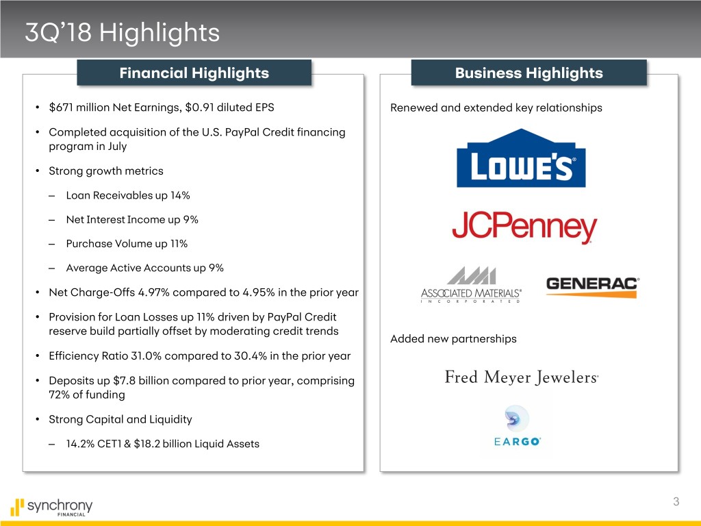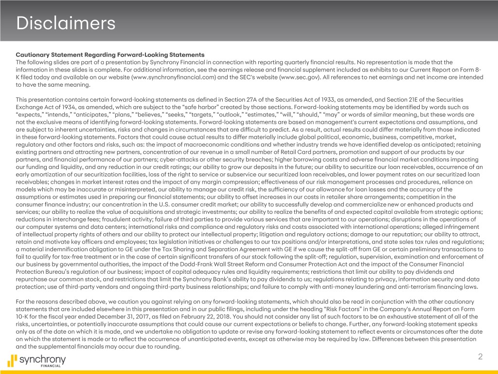 Disclaimers Cautionary Statement Regarding Forward-Looking Statements The following slides are part of a presentation by Synchrony Financial in connection with reporting quarterly financial results. No representation is made that the information in these slides is complete. For additional information, see the earnings release and financial supplement included as exhibits to our Current Report on Form 8- K filed today and available on our website (www.synchronyfinancial.com) and the SEC's website (www.sec.gov). All references to net earnings and net income are intended to have the same meaning. This presentation contains certain forward-looking statements as defined in Section 27A of the Securities Act of 1933, as amended, and Section 21E of the Securities Exchange Act of 1934, as amended, which are subject to the “safe harbor” created by those sections. Forward-looking statements may be identified by words such as “expects,” “intends,” “anticipates,” “plans,” “believes,” “seeks,” “targets,” “outlook,” “estimates,” “will,” “should,” “may” or words of similar meaning, but these words are not the exclusive means of identifying forward-looking statements. Forward-looking statements are based on management's current expectations and assumptions, and are subject to inherent uncertainties, risks and changes in circumstances that are difficult to predict. As a result, actual results could differ materially from those indicated in these forward-looking statements. Factors that could cause actual results to differ materially include global political, economic, business, competitive, market, regulatory and other factors and risks, such as: the impact of macroeconomic conditions and whether industry trends we have identified develop as anticipated; retaining existing partners and attracting new partners, concentration of our revenue in a small number of Retail Card partners, promotion and support of our products by our partners, and financial performance of our partners; cyber-attacks or other security breaches; higher borrowing costs and adverse financial market conditions impacting our funding and liquidity, and any reduction in our credit ratings; our ability to grow our deposits in the future; our ability to securitize our loan receivables, occurrence of an early amortization of our securitization facilities, loss of the right to service or subservice our securitized loan receivables, and lower payment rates on our securitized loan receivables; changes in market interest rates and the impact of any margin compression; effectiveness of our risk management processes and procedures, reliance on models which may be inaccurate or misinterpreted, our ability to manage our credit risk, the sufficiency of our allowance for loan losses and the accuracy of the assumptions or estimates used in preparing our financial statements; our ability to offset increases in our costs in retailer share arrangements; competition in the consumer finance industry; our concentration in the U.S. consumer credit market; our ability to successfully develop and commercialize new or enhanced products and services; our ability to realize the value of acquisitions and strategic investments; our ability to realize the benefits of and expected capital available from strategic options; reductions in interchange fees; fraudulent activity; failure of third parties to provide various services that are important to our operations; disruptions in the operations of our computer systems and data centers; international risks and compliance and regulatory risks and costs associated with international operations; alleged infringement of intellectual property rights of others and our ability to protect our intellectual property; litigation and regulatory actions; damage to our reputation; our ability to attract, retain and motivate key officers and employees; tax legislation initiatives or challenges to our tax positions and/or interpretations, and state sales tax rules and regulations; a material indemnification obligation to GE under the Tax Sharing and Separation Agreement with GE if we cause the split-off from GE or certain preliminary transactions to fail to qualify for tax-free treatment or in the case of certain significant transfers of our stock following the split-off; regulation, supervision, examination and enforcement of our business by governmental authorities, the impact of the Dodd-Frank Wall Street Reform and Consumer Protection Act and the impact of the Consumer Financial Protection Bureau’s regulation of our business; impact of capital adequacy rules and liquidity requirements; restrictions that limit our ability to pay dividends and repurchase our common stock, and restrictions that limit the Synchrony Bank’s ability to pay dividends to us; regulations relating to privacy, information security and data protection; use of third-party vendors and ongoing third-party business relationships; and failure to comply with anti-money laundering and anti-terrorism financing laws. For the reasons described above, we caution you against relying on any forward-looking statements, which should also be read in conjunction with the other cautionary statements that are included elsewhere in this presentation and in our public filings, including under the heading “Risk Factors” in the Company's Annual Report on Form 10-K for the fiscal year ended December 31, 2017, as filed on February 22, 2018. You should not consider any list of such factors to be an exhaustive statement of all of the risks, uncertainties, or potentially inaccurate assumptions that could cause our current expectations or beliefs to change. Further, any forward-looking statement speaks only as of the date on which it is made, and we undertake no obligation to update or revise any forward-looking statement to reflect events or circumstances after the date on which the statement is made or to reflect the occurrence o