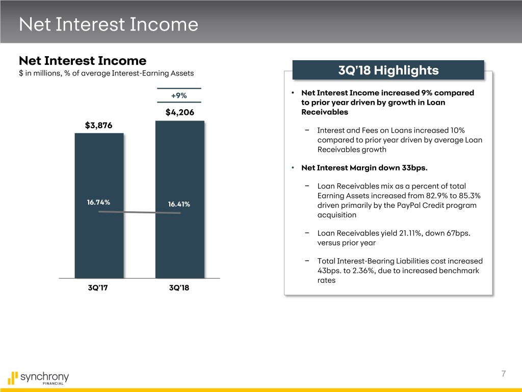 Financial Results Summary Earnings Statement 3Q'18 Highlights B/(W) • $671 million Net Earnings, $0.91 diluted EPS $ in millions, except ratios 3Q'18 3Q'17 $ % • Net Interest Income up 9% driven by growth in Total Interest Income $4,694 $4,233 $461 11% Loan Receivables Total Interest Expense 488 357 (131) (37)% − Interest and Fees on Loans up 10% driven by average Loan Receivables growth Net Interest Income (NII) 4,206 3,876 330 9% − Interest Expense increase driven by increased Retailer Share Arrangements (RSA) (871) (805) (66) (8)% benchmark rates and growth NII, after RSA 3,335 3,071 264 9% • Retailer Share Arrangements up 8% − Increase driven by growth Provision for Loan Losses 1,451 1,310 (141) (11)% • Provision for Loan Losses up 11% driven by the Other Income 63 76 (13) (17)% PayPal Credit reserve build partially offset by moderating credit trends Other Expense 1,054 958 (96) (10)% − Net Charge-Offs of 4.97% compared to 4.95% in Pre-Tax Earnings 893 879 14 2% the prior year Provision for Income Taxes 222 324 102 31% • Other Expense up 10% − Net Earnings $671 $555 $116 21% Driven primarily by PayPal Credit program acquisition and growth Diluted Earnings Per Share $0.91 $0.70 $0.21 • Provision for Income Taxes down 31% 6