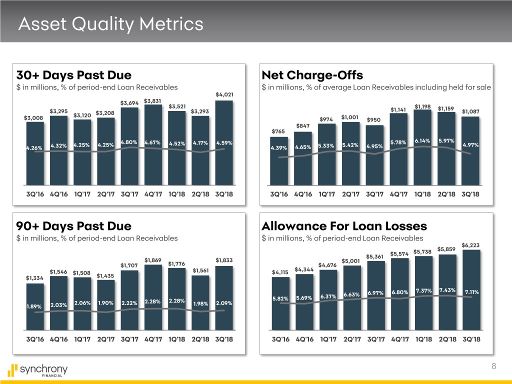 Asset Quality Metrics 30+ Days Past Due Net Charge-Offs $ in millions, % of period-end Loan Receivables $ in millions, % of average Loan Receivables including held for sale $4,021 $3,694 $3,831 $3,521 $1,198 $1,159 $3,295 $3,293 $1,141 $1,087 $3,120 $3,208 $3,008 $974 $1,001 $950 $847 $765 6.14% 5.97% 4.25% 4.25% 4.80% 4.67% 4.52% 4.17% 4.59% 5.42% 5.78% 4.97% 4.26% 4.32% 4.39% 4.65% 5.33% 4.95% 3Q'16 4Q'16 1Q'17 2Q'17 3Q'17 4Q'17 1Q'18 2Q'18 3Q'18 3Q'16 4Q'16 1Q'17 2Q'17 3Q'17 4Q'17 1Q'18 2Q'18 3Q'18 90+ Days Past Due Allowance For Loan Losses $ in millions, % of period-end Loan Receivables $ in millions, % of period-end Loan Receivables $6,223 $5,738 $5,859 $5,361 $5,574 $1,869 $1,833 $5,001 $1,707 $1,776 $4,676 $4,344 $1,546 $1,508 $1,561 $4,115 $1,334 $1,435 7.37% 7.43% 6.63% 6.97% 6.80% 7.11% 5.82% 5.69% 6.37% 2.06% 1.90% 2.22% 2.28% 2.28% 2.09% 1.89% 2.03% 1.98% 3Q'16 4Q'16 1Q'17 2Q'17 3Q'17 4Q'17 1Q'18 2Q'18 3Q'18 3Q'16 4Q'16 1Q'17 2Q'17 3Q'17 4Q'17 1Q'18 2Q'18 3Q'18 8