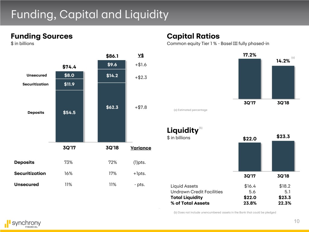 Other Expense Other Expense $ in millions +10% 3Q'18 Highlights $1,054 $958 • Other Expense up 10% ‒ Other Expense increase driven primarily by PayPal Credit program acquisition and growth • Efficiency Ratio 31.0% vs. 30.4% prior year 3Q'17 3Q'18 V$ V% Employee Costs $333 $365 $32 10% Professional Fees 161 232 71 44% Marketing/BD 124 131 7 6% Information Processing 96 105 9 9% Other 244 221 (23) (9)% Other Expense $958 $1,054 $96 10% (a) Efficiency 30.4% 31.0% 0.6pts. (a) “Other Expense” divided by sum of “NII, after RSA” plus “Other Income” 9
