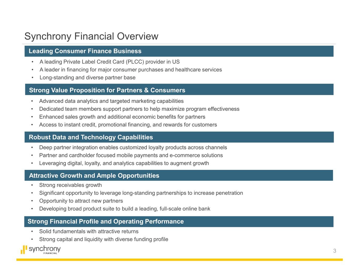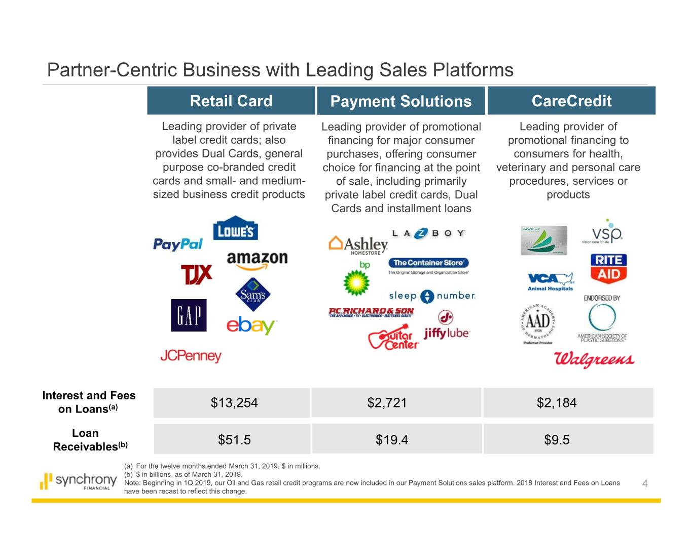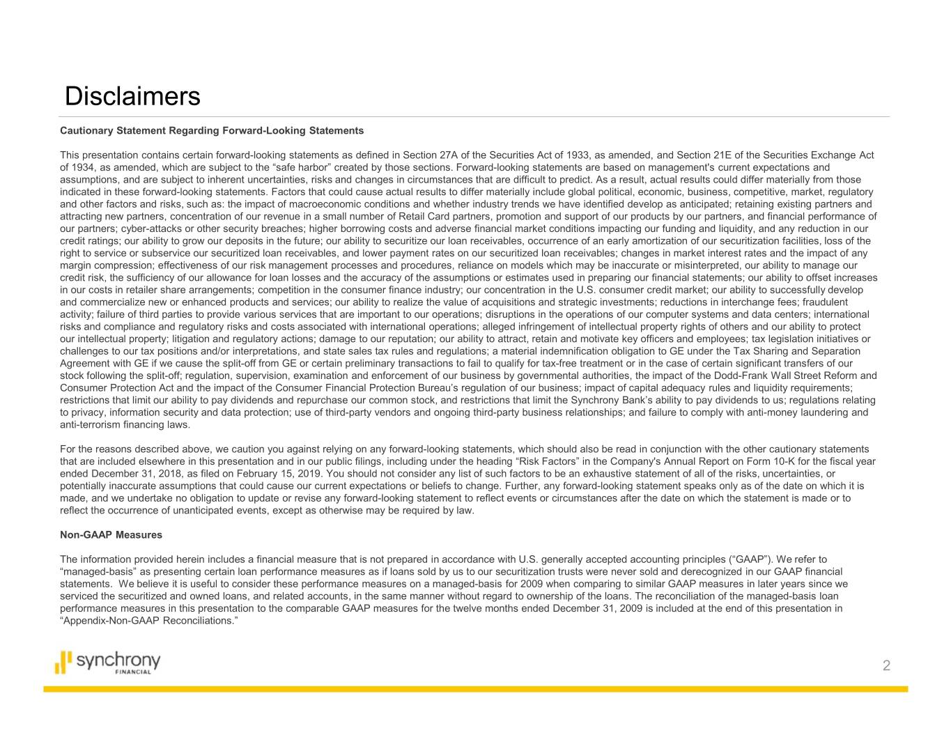 Disclaimers Cautionary Statement Regarding Forward-Looking Statements This presentation contains certain forward-looking statements as defined in Section 27A of the Securities Act of 1933, as amended, and Section 21E of the Securities Exchange Act of 1934, as amended, which are subject to the “safe harbor” created by those sections. Forward-looking statements are based on management's current expectations and assumptions, and are subject to inherent uncertainties, risks and changes in circumstances that are difficult to predict. As a result, actual results could differ materially from those indicated in these forward-looking statements. Factors that could cause actual results to differ materially include global political, economic, business, competitive, market, regulatory and other factors and risks, such as: the impact of macroeconomic conditions and whether industry trends we have identified develop as anticipated; retaining existing partners and attracting new partners, concentration of our revenue in a small number of Retail Card partners, promotion and support of our products by our partners, and financial performance of our partners; cyber-attacks or other security breaches; higher borrowing costs and adverse financial market conditions impacting our funding and liquidity, and any reduction in our credit ratings; our ability to grow our deposits in the future; our ability to securitize our loan receivables, occurrence of an early amortization of our securitization facilities, loss of the right to service or subservice our securitized loan receivables, and lower payment rates on our securitized loan receivables; changes in market interest rates and the impact of any margin compression; effectiveness of our risk management processes and procedures, reliance on models which may be inaccurate or misinterpreted, our ability to manage our credit risk, the sufficiency of our allowance for loan losses and the accuracy of the assumptions or estimates used in preparing our financial statements; our ability to offset increases in our costs in retailer share arrangements; competition in the consumer finance industry; our concentration in the U.S. consumer credit market; our ability to successfully develop and commercialize new or enhanced products and services; our ability to realize the value of acquisitions and strategic investments; reductions in interchange fees; fraudulent activity; failure of third parties to provide various services that are important to our operations; disruptions in the operations of our computer systems and data centers; international risks and compliance and regulatory risks and costs associated with international operations; alleged infringement of intellectual property rights of others and our ability to protect our intellectual property; litigation and regulatory actions; damage to our reputation; our ability to attract, retain and motivate key officers and employees; tax legislation initiatives or challenges to our tax positions and/or interpretations, and state sales tax rules and regulations; a material indemnification obligation to GE under the Tax Sharing and Separation Agreement with GE if we cause the split-off from GE or certain preliminary transactions to fail to qualify for tax-free treatment or in the case of certain significant transfers of our stock following the split-off; regulation, supervision, examination and enforcement of our business by governmental authorities, the impact of the Dodd-Frank Wall Street Reform and Consumer Protection Act and the impact of the Consumer Financial Protection Bureau’s regulation of our business; impact of capital adequacy rules and liquidity requirements; restrictions that limit our ability to pay dividends and repurchase our common stock, and restrictions that limit the Synchrony Bank’s ability to pay dividends to us; regulations relating to privacy, information security and data protection; use of third-party vendors and ongoing third-party business relationships; and failure to comply with anti-money laundering and anti-terrorism financing laws. For the reasons described above, we caution you against relying on any forward-looking statements, which should also be read in conjunction with the other cautionary statements that are included elsewhere in this presentation and in our public filings, including under the heading “Risk Factors” in the Company's Annual Report on Form 10-K for the fiscal year ended December 31, 2018, as filed on February 15, 2019. You should not consider any list of such factors to be an exhaustive statement of all of the risks, uncertainties, or potentially inaccurate assumptions that could cause our current expectations or beliefs to change. Further, any forward-looking statement speaks only as of the date on which it is made, and we undertake no obligation to update or revise any forward-looking statement to reflect events or circumstances after the date on which the statement is made or to reflect the occurrence of unanticipated events, except as otherwise may be required by law. Non-GAAP Measures The information provided herein includes a financial measure that is not prepared in accordance with U.S. generally accepted accounting principles (“GAAP”). We refer to “managed-basis” as presenting certain loan performance measures as if loans sold by us to our securitization trusts were never sold and derecognized in our GAAP financial statements. We believe it is useful to consider these performance measures on a managed-basis for 2009 when comparing to similar GAAP measures in later years since we serviced the securitized and owned loans, and related accounts, in the same manner without regard to ownership of the loans. The reconciliation of the managed-basis loan performance measures in this presentation to the comparable GAAP measures for the twelve months ended December 31, 2009 is included at the end of this presentation in “Appendix-Non-GAAP Reconciliations.