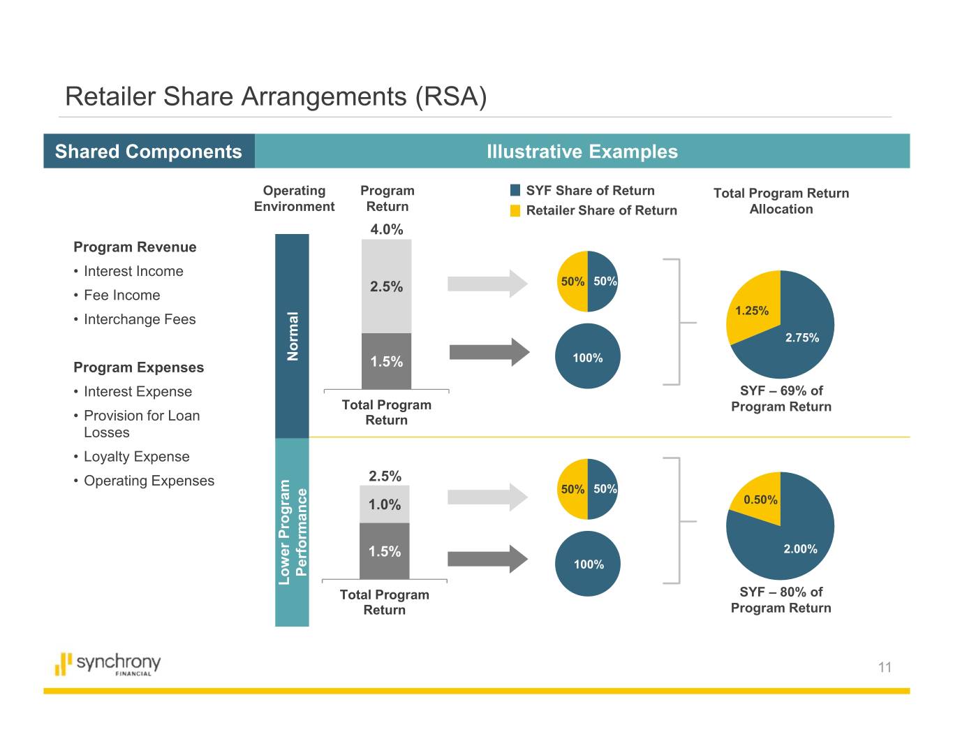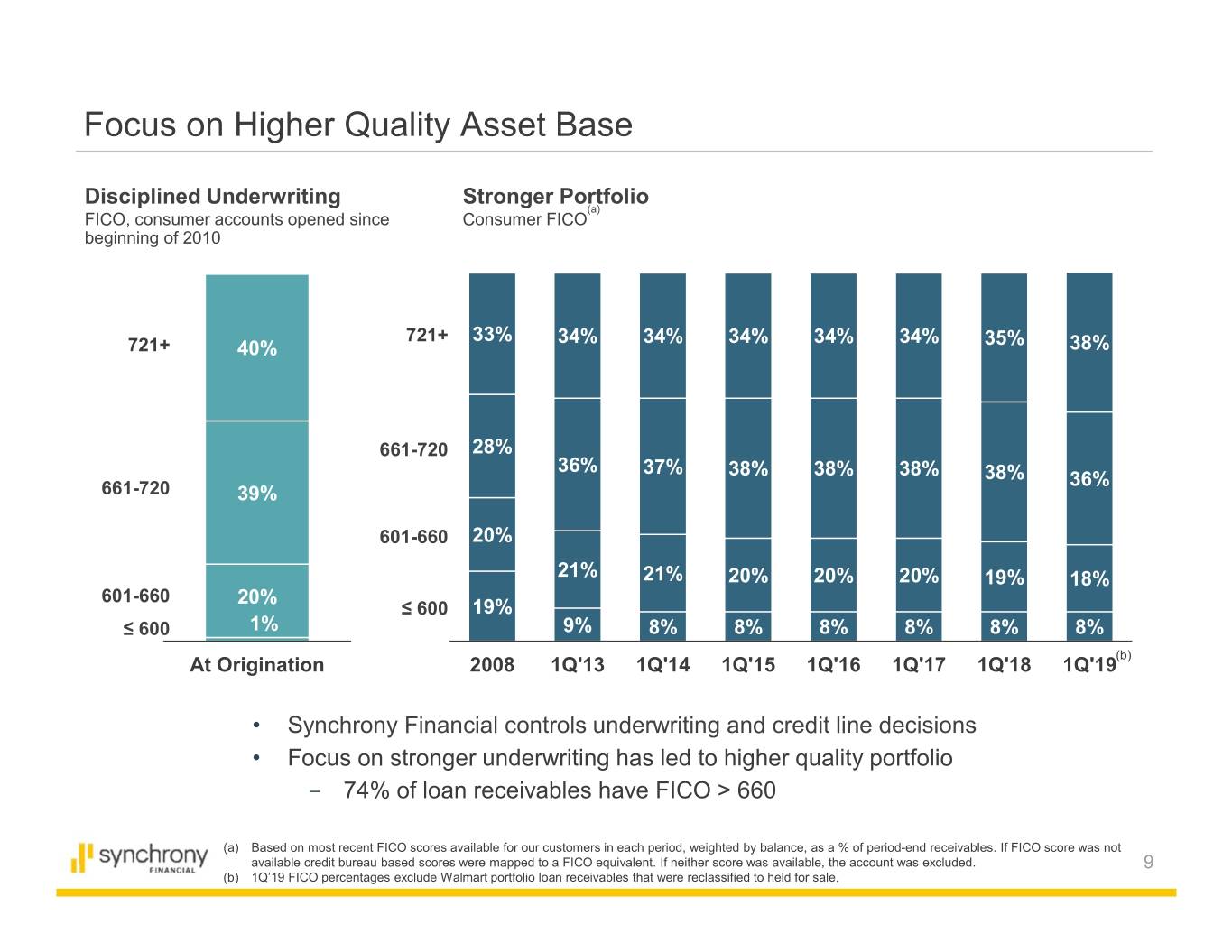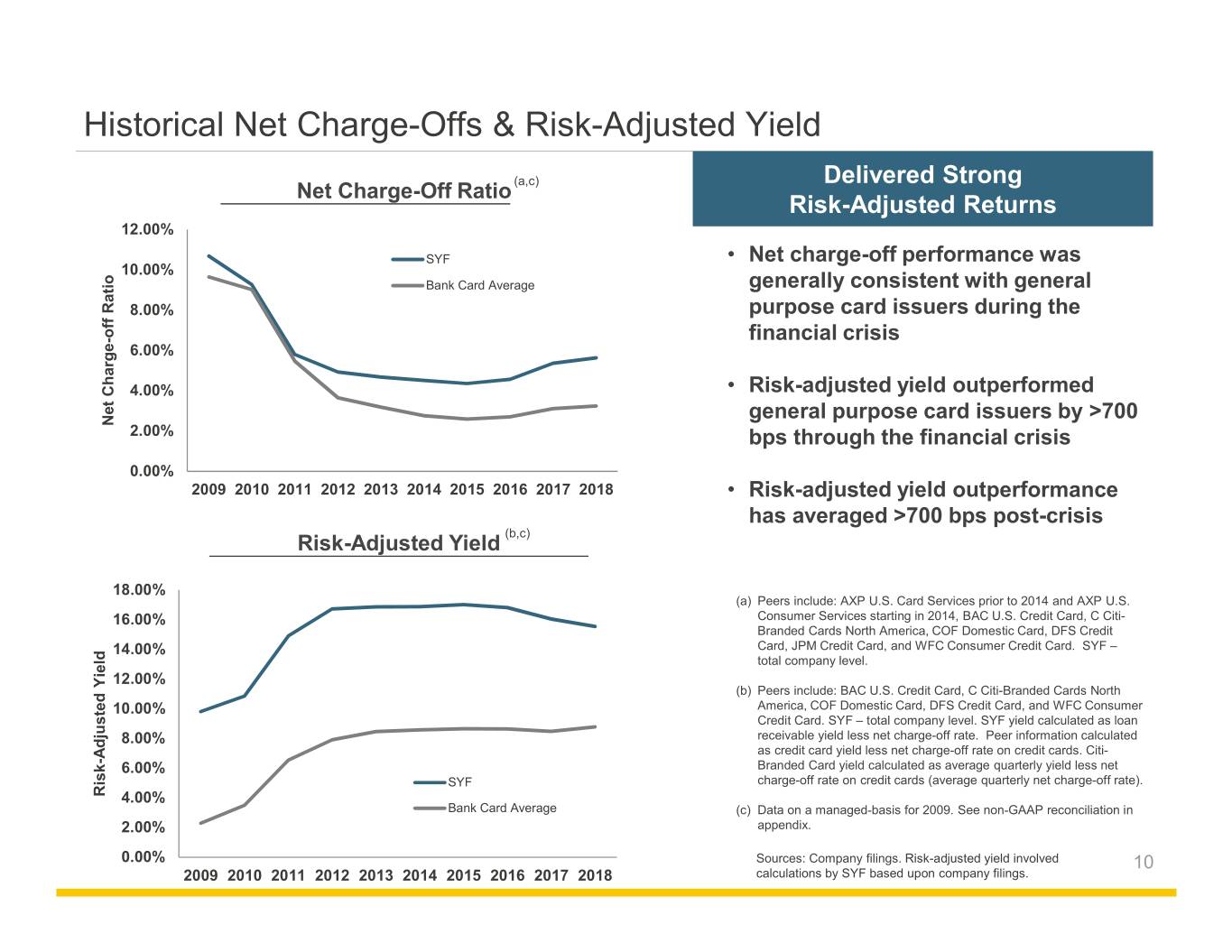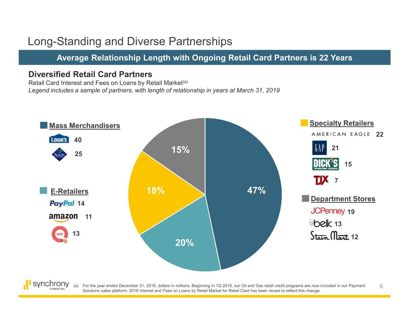 Disclaimers Cautionary Statement Regarding Forward-Looking Statements This presentation contains certain forward-looking statements as defined in Section 27A of the Securities Act of 1933, as amended, and Section 21E of the Securities Exchange Act of 1934, as amended, which are subject to the “safe harbor” created by those sections. Forward-looking statements are based on management's current expectations and assumptions, and are subject to inherent uncertainties, risks and changes in circumstances that are difficult to predict. As a result, actual results could differ materially from those indicated in these forward-looking statements. Factors that could cause actual results to differ materially include global political, economic, business, competitive, market, regulatory and other factors and risks, such as: the impact of macroeconomic conditions and whether industry trends we have identified develop as anticipated; retaining existing partners and attracting new partners, concentration of our revenue in a small number of Retail Card partners, promotion and support of our products by our partners, and financial performance of our partners; cyber-attacks or other security breaches; higher borrowing costs and adverse financial market conditions impacting our funding and liquidity, and any reduction in our credit ratings; our ability to grow our deposits in the future; our ability to securitize our loan receivables, occurrence of an early amortization of our securitization facilities, loss of the right to service or subservice our securitized loan receivables, and lower payment rates on our securitized loan receivables; changes in market interest rates and the impact of any margin compression; effectiveness of our risk management processes and procedures, reliance on models which may be inaccurate or misinterpreted, our ability to manage our credit risk, the sufficiency of our allowance for loan losses and the accuracy of the assumptions or estimates used in preparing our financial statements; our ability to offset increases in our costs in retailer share arrangements; competition in the consumer finance industry; our concentration in the U.S. consumer credit market; our ability to successfully develop and commercialize new or enhanced products and services; our ability to realize the value of acquisitions and strategic investments; reductions in interchange fees; fraudulent activity; failure of third parties to provide various services that are important to our operations; disruptions in the operations of our computer systems and data centers; international risks and compliance and regulatory risks and costs associated with international operations; alleged infringement of intellectual property rights of others and our ability to protect our intellectual property; litigation and regulatory actions; damage to our reputation; our ability to attract, retain and motivate key officers and employees; tax legislation initiatives or challenges to our tax positions and/or interpretations, and state sales tax rules and regulations; a material indemnification obligation to GE under the Tax Sharing and Separation Agreement with GE if we cause the split-off from GE or certain preliminary transactions to fail to qualify for tax-free treatment or in the case of certain significant transfers of our stock following the split-off; regulation, supervision, examination and enforcement of our business by governmental authorities, the impact of the Dodd-Frank Wall Street Reform and Consumer Protection Act and the impact of the Consumer Financial Protection Bureau’s regulation of our business; impact of capital adequacy rules and liquidity requirements; restrictions that limit our ability to pay dividends and repurchase our common stock, and restrictions that limit the Synchrony Bank’s ability to pay dividends to us; regulations relating to privacy, information security and data protection; use of third-party vendors and ongoing third-party business relationships; and failure to comply with anti-money laundering and anti-terrorism financing laws. For the reasons described above, we caution you against relying on any forward-looking statements, which should also be read in conjunction with the other cautionary statements that are included elsewhere in this presentation and in our public filings, including under the heading “Risk Factors” in the Company's Annual Report on Form 10-K for the fiscal year ended December 31, 2018, as filed on February 15, 2019. You should not consider any list of such factors to be an exhaustive statement of all of the risks, uncertainties, or potentially inaccurate assumptions that could cause our current expectations or beliefs to change. Further, any forward-looking statement speaks only as of the date on which it is made, and we undertake no obligation to update or revise any forward-looking statement to reflect events or circumstances after the date on which the statement is made or to reflect the occurrence of unanticipated events, except as otherwise may be required by law. Non-GAAP Measures The information provided herein includes a financial measure that is not prepared in accordance with U.S. generally accepted accounting principles (“GAAP”). We refer to “managed-basis” as presenting certain loan performance measures as if loans sold by us to our securitization trusts were never sold and derecognized in our GAAP financial statements. We believe it is useful to consider these performance measures on a managed-basis for 2009 when comparing to similar GAAP measures in later years since we serviced the securitized and owned loans, and related accounts, in the same manner without regard to ownership of the loans. The reconciliation of the managed-basis loan performance measures in this presentation to the comparable GAAP measures for the twelve months ended December 31, 2009 is included at the end of this presentation in “Appendix-Non-GAAP Reconciliations.