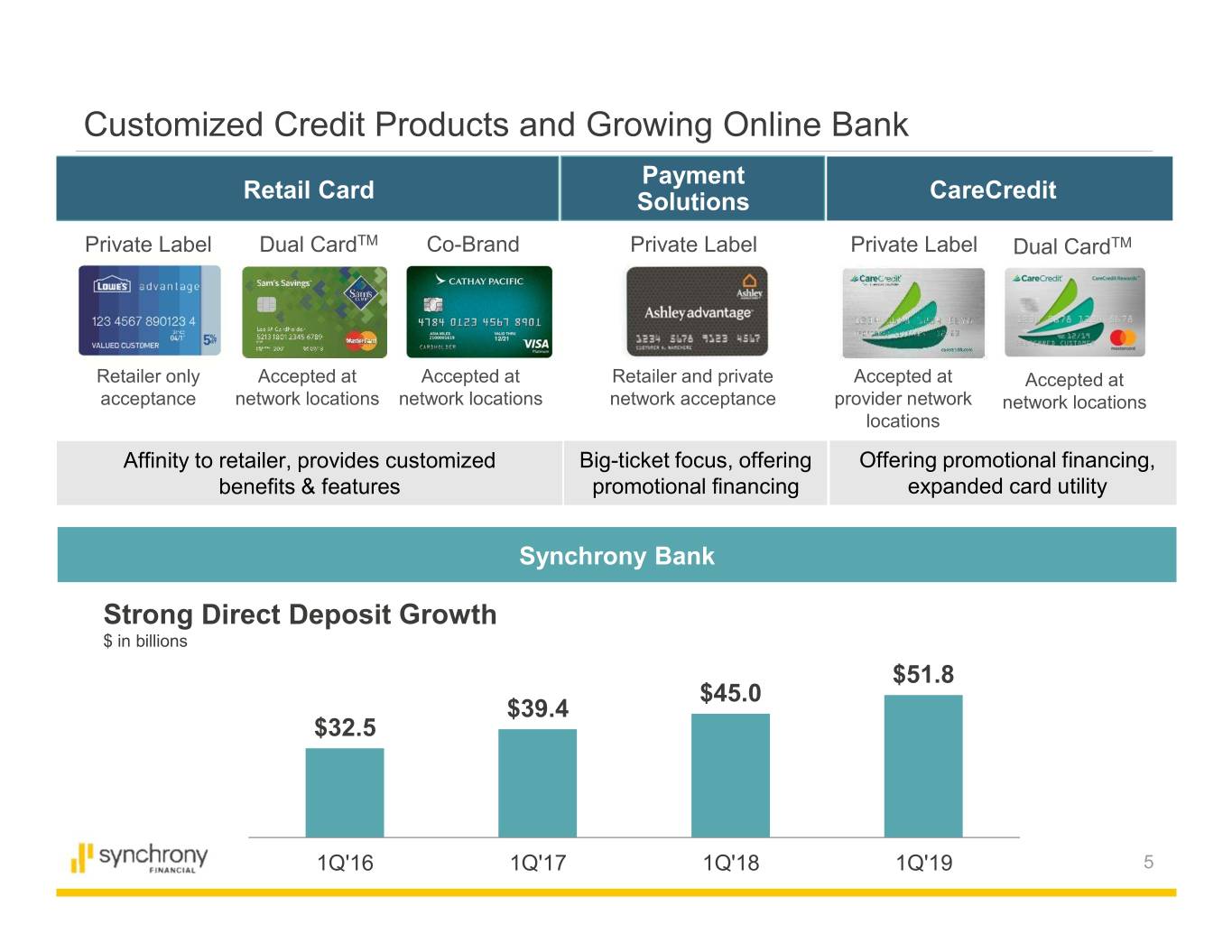 Customized Credit Products and Growing Online Bank Payment Retail Card Solutions CareCredit Private Label Dual Card TM Co-Brand Private Label Private Label Dual Card TM Retailer only Accepted at Accepted at Retailer and private Accepted at Accepted at acceptance network locations network locations network acceptance provider network network locations locations Affinity to retailer, provides customized Big-ticket focus, offering Offering promotional financing, benefits & features promotional financing expanded card utility Synchrony Bank Strong Direct Deposit Growth $ in billions $51.8 $45.0 $39.4 $32.5 1Q'16 1Q'17 1Q'18 1Q'19 5