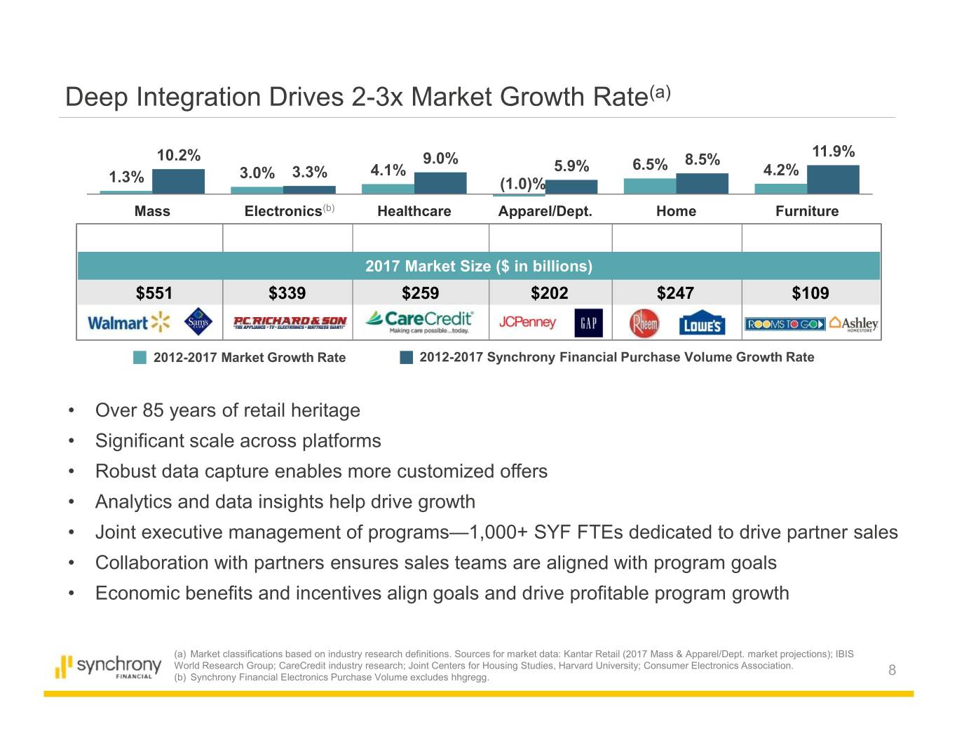 Deep Integration Drives 2-3x Market Growth Rate (a) 10.2% 11.9% 9.0% 6.5% 8.5% 3.0% 3.3% 4.1% 5.9% 4.2% 1.3% (1.0)% Mass Electronics (b) Healthcare Apparel/Dept. Home Furniture 2017 Market Size ($ in billions) $551 $339 $259 $202 $247 $109 2012-2017 Market Growth Rate 2012-2017 Synchrony Financial Purchase Volume Growth Rate • Over 85 years of retail heritage • Significant scale across platforms • Robust data capture enables more customized offers • Analytics and data insights help drive growth • Joint executive management of programs—1,000+ SYF FTEs dedicated to drive partner sales • Collaboration with partners ensures sales teams are aligned with program goals • Economic benefits and incentives align goals and drive profitable program growth (a) Market classifications based on industry research definitions. Sources for market data: Kantar Retail (2017 Mass & Apparel/Dept. market projections); IBIS World Research Group; CareCredit industry research; Joint Centers for Housing Studies, Harvard University; Consumer Electronics Association. (b) Synchrony Financial Electronics Purchase Volume excludes hhgregg. 8