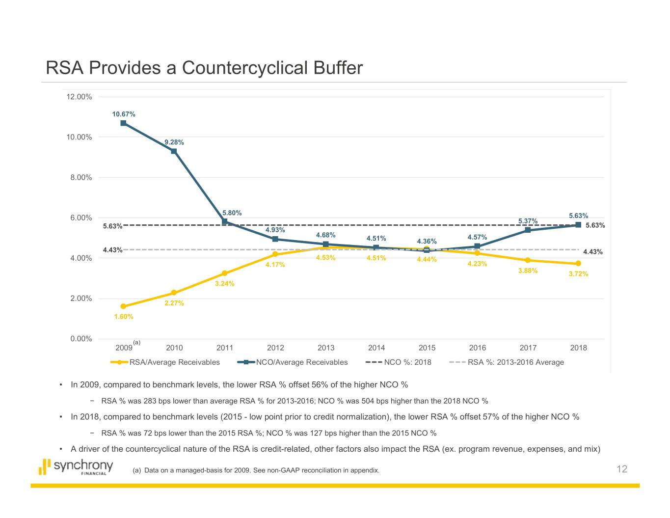 RSA Provides a Countercyclical Buffer 12.00% 10.67% 10.00% 9.28% 8.00% 5.80% 5.63% 6.00% 5.37% 5.63% 5.63% 4.93% 4.68% 4.57% 4.51% 4.36% 4.43% 4.43% 4.00% 4.53% 4.51% 4.44% 4.17% 4.23% 3.88% 3.72% 3.24% 2.00% 2.27% 1.60% 0.00% (a) 2009 2010 2011 2012 2013 2014 2015 2016 2017 2018 RSA/Average Receivables NCO/Average Receivables NCO %: 2018 RSA %: 2013-2016 Average • In 2009, compared to benchmark levels, the lower RSA % offset 56% of the higher NCO % − RSA % was 283 bps lower than average RSA % for 2013-2016; NCO % was 504 bps higher than the 2018 NCO % • In 2018, compared to benchmark levels (2015 - low point prior to credit normalization), the lower RSA % offset 57% of the higher NCO % − RSA % was 72 bps lower than the 2015 RSA %; NCO % was 127 bps higher than the 2015 NCO % • A driver of the countercyclical nature of the RSA is credit-related, other factors also impact the RSA (ex. program revenue, expenses, and mix) (a) Data on a managed-basis for 2009. See non-GAAP reconciliation in appendix. 12