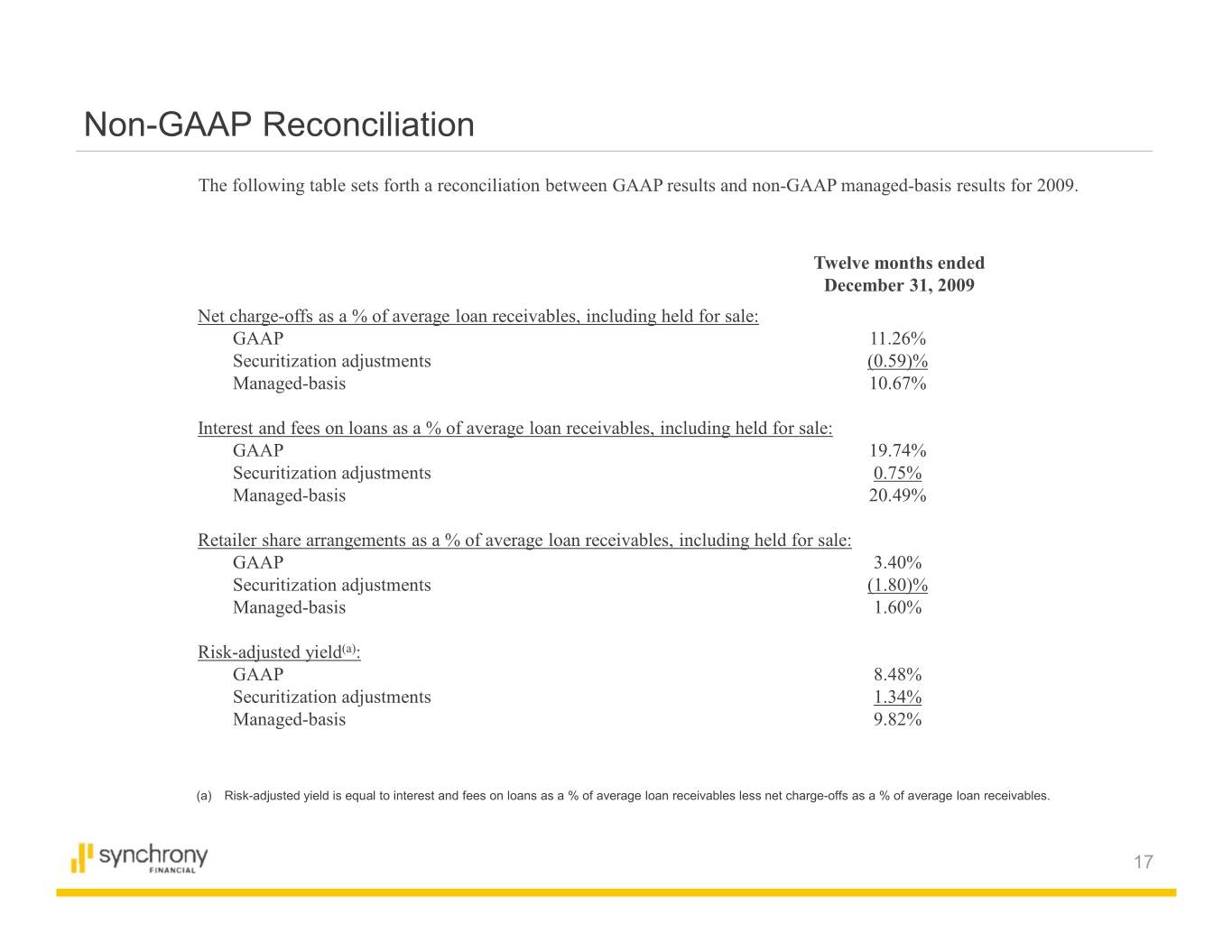 Non-GAAP Reconciliation The following table sets forth a reconciliation between GAAP results and non-GAAP managed-basis results for 2009. Twelve months ended December 31, 2009 Net charge-offs as a % of average loan receivables, including held for sale: GAAP 11.26% Securitization adjustments (0.59)% Managed-basis 10.67% Interest and fees on loans as a % of average loan receivables, including held for sale: GAAP 19.74% Securitization adjustments 0.75% Managed-basis 20.49% Retailer share arrangements as a % of average loan receivables, including held for sale: GAAP 3.40% Securitization adjustments (1.80)% Managed-basis 1.60% Risk-adjusted yield (a) : GAAP 8.48% Securitization adjustments 1.34% Managed-basis 9.82% (a) Risk-adjusted yield is equal to interest and fees on loans as a % of average loan receivables less net charge-offs as a % of average loan receivables. 17